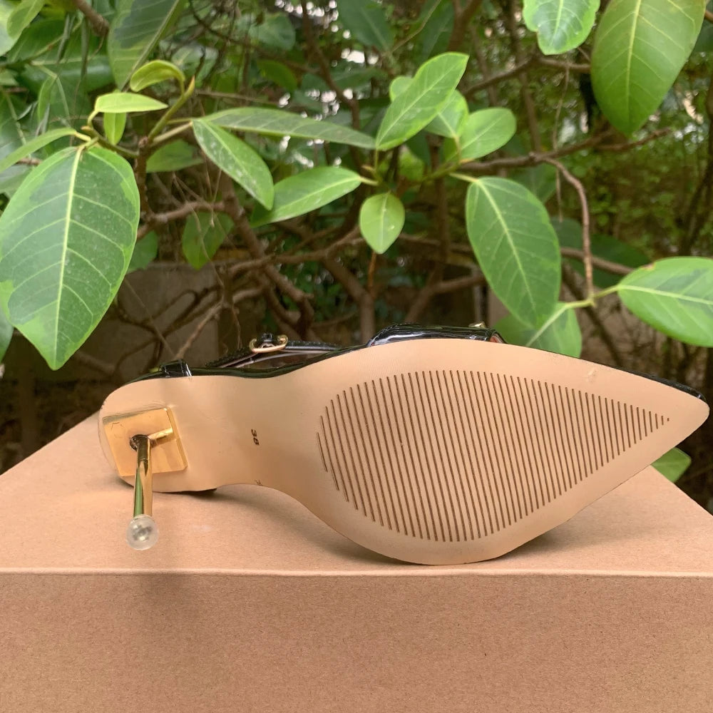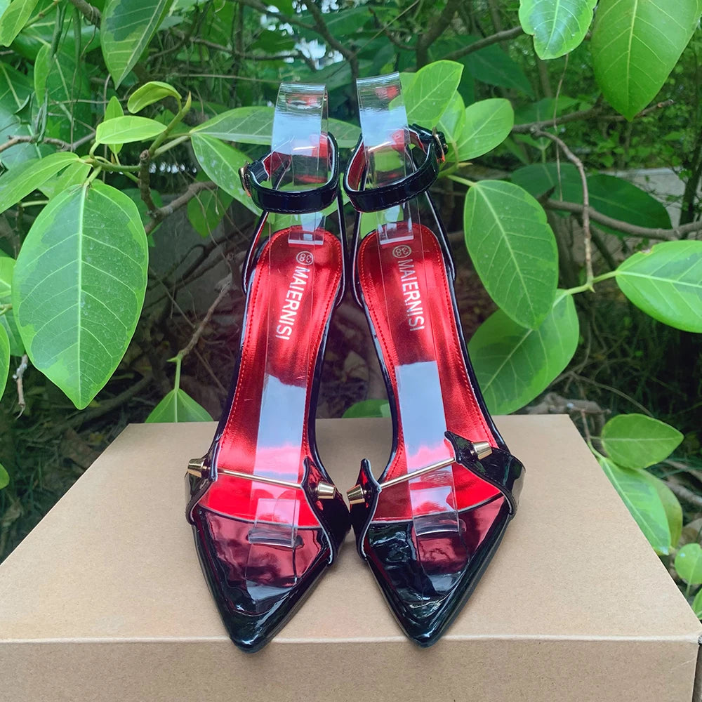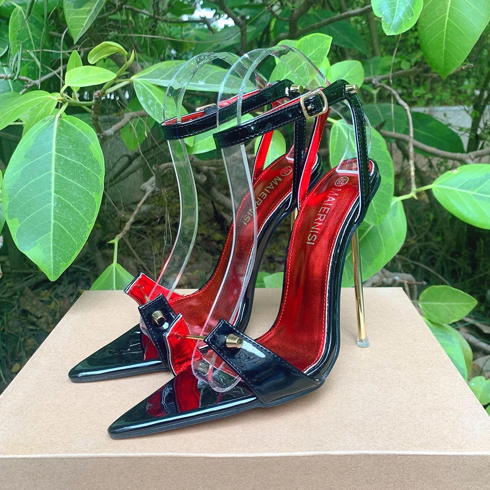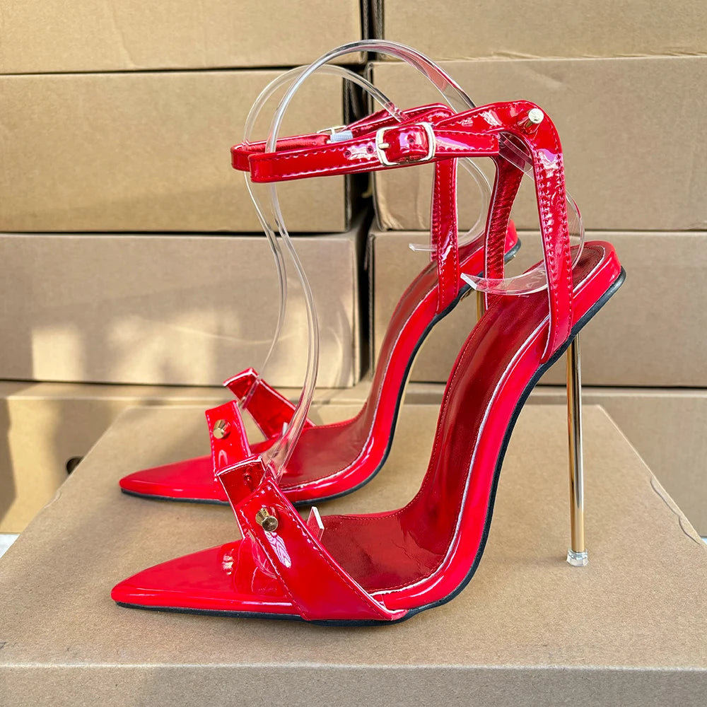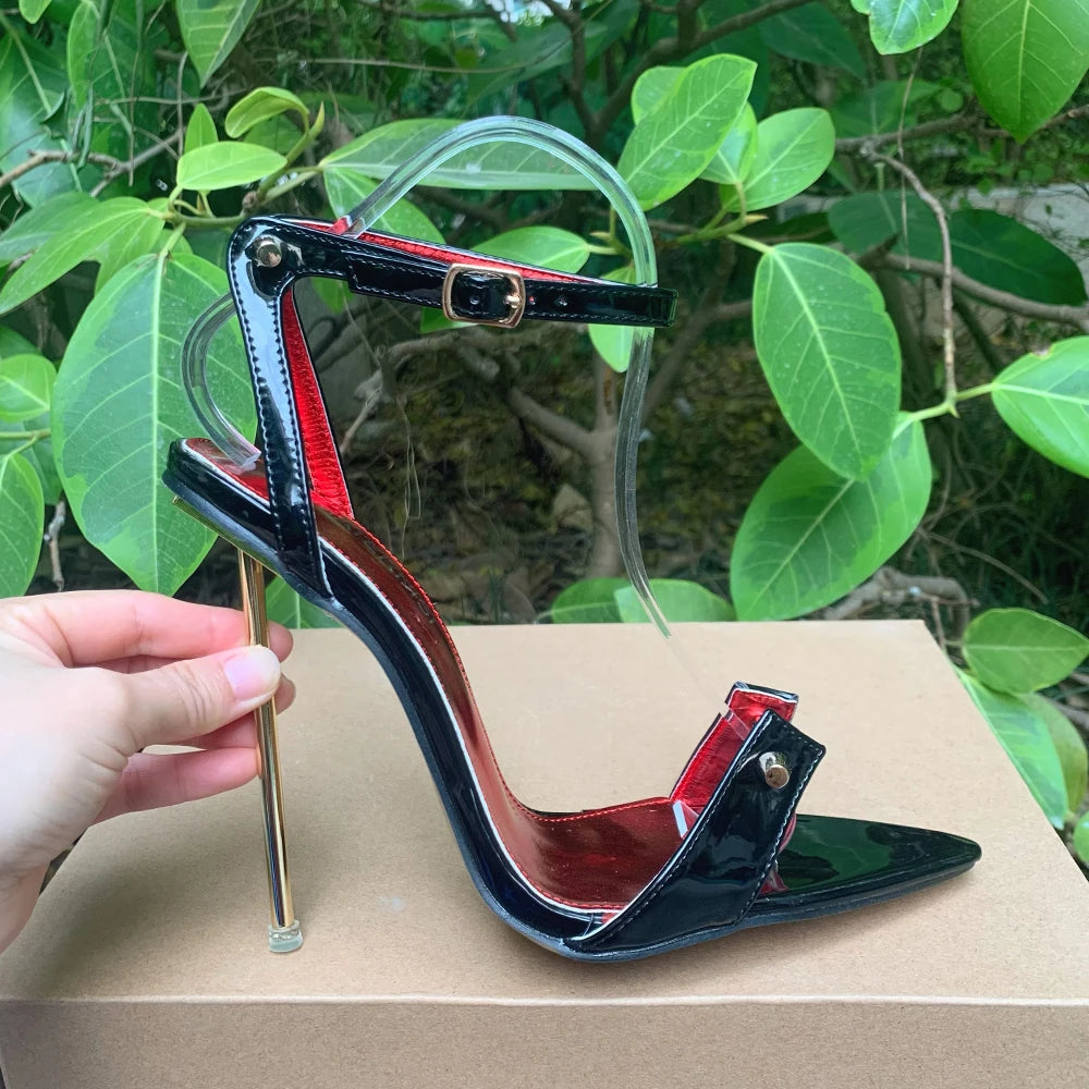 Sandalias de tacón alto de metal de 12 cm para mujer, zapatos de verano sexys con tiras en el tobillo, punta puntiaguda, color negro, unisex
