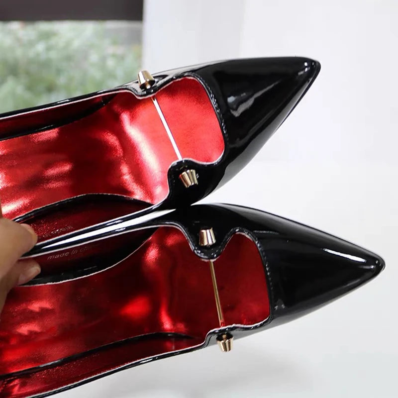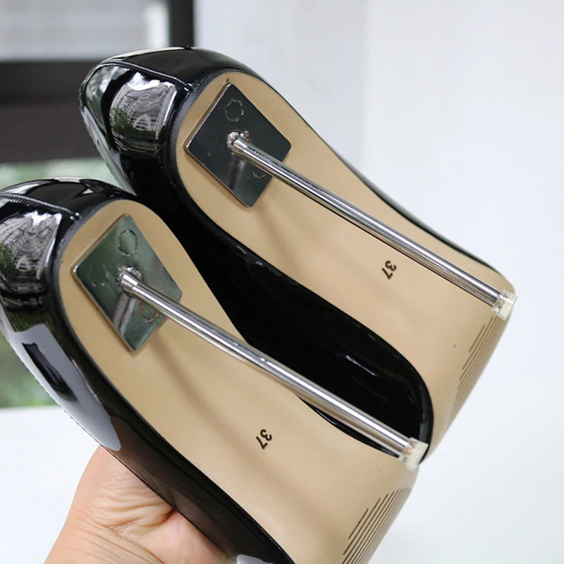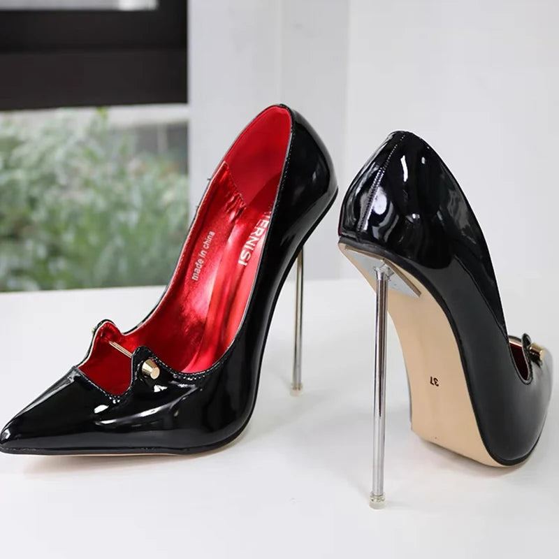 Zapatos de tacón alto de aguja de metal de 12 cm, color negro liso, para oficina, fiesta, punta puntiaguda, unisex, talla 46