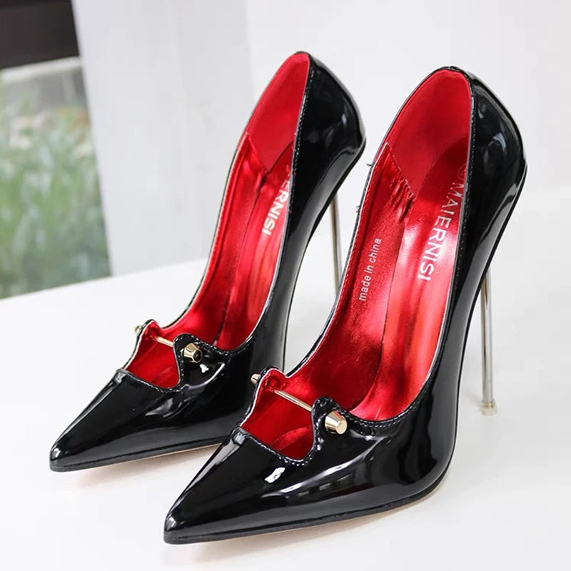 Zapatos de tacón alto de aguja de metal de 12 cm para oficina, fiesta, color negro liso, para mujer