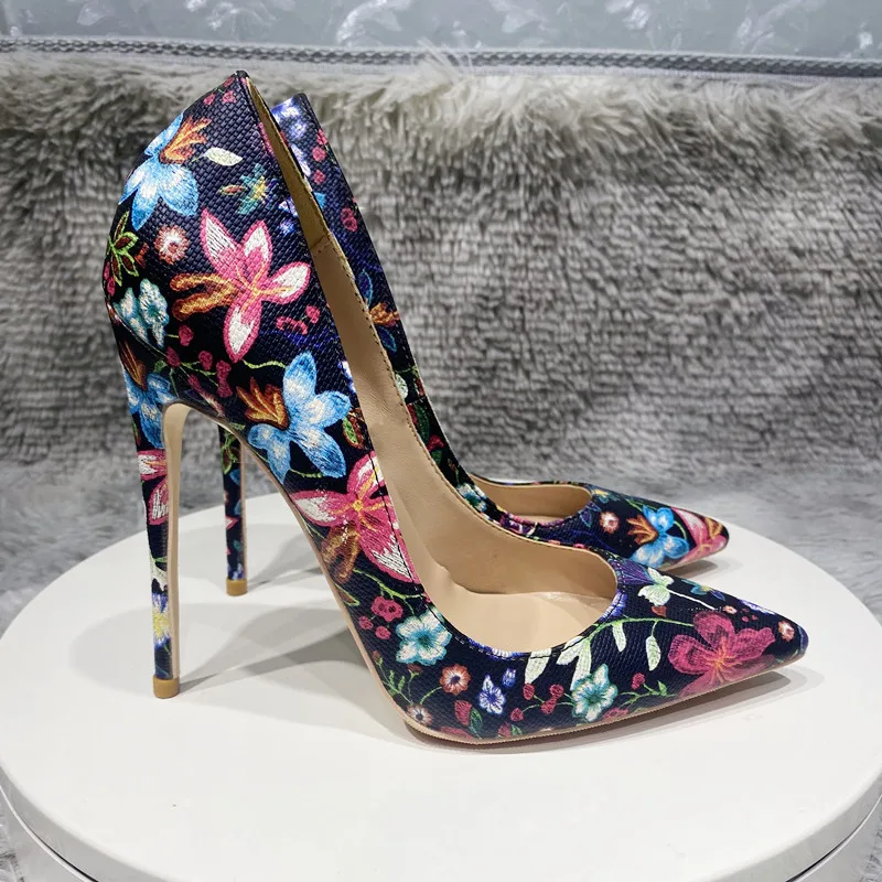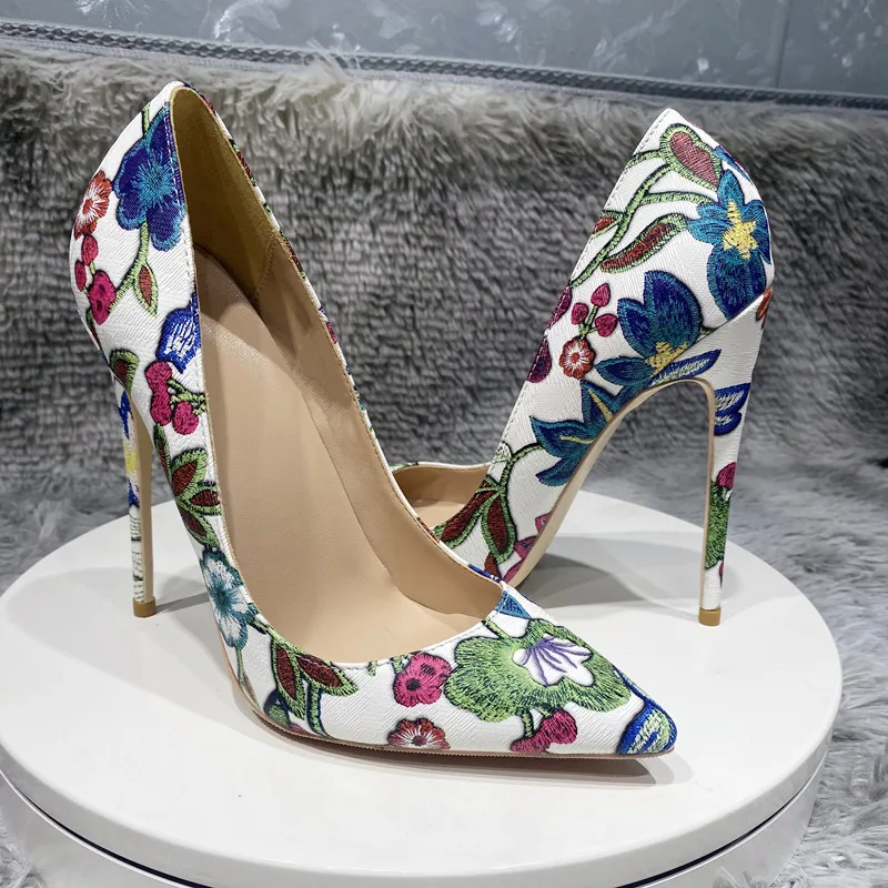 Zapatos de tacón alto para mujer de 12 cm con grafiti blanco, tacones puntiagudos, sin cordones, de diseñador, para boda, de corte poco profundo y estrecho.