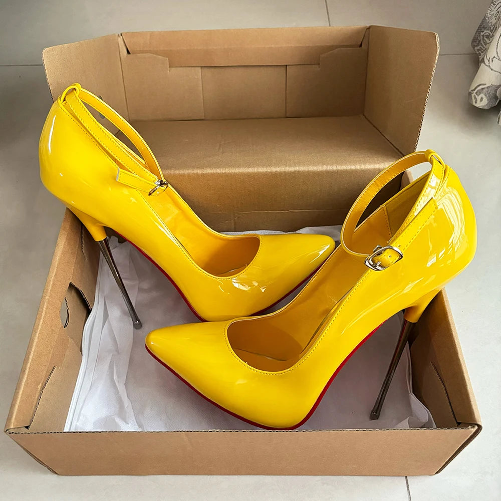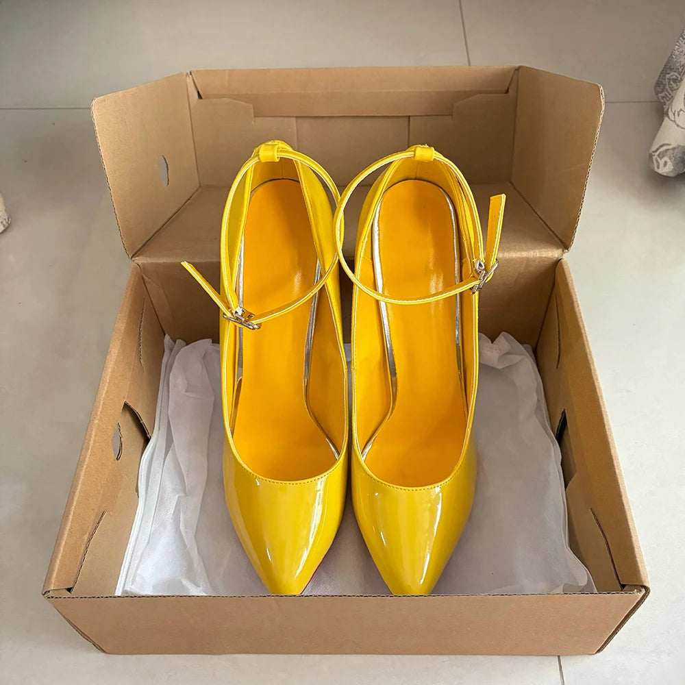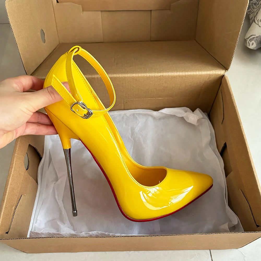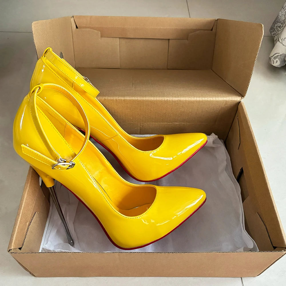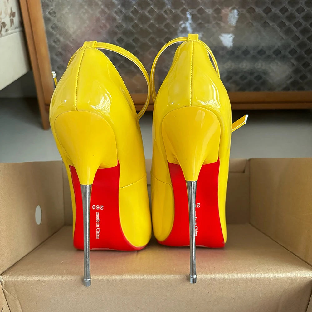 Zapatos de tacón alto de metal de 16 cm para mujer, sexys, con correa en el tobillo, color amarillo brillante, modelo fetiche, fotografía personalizada.