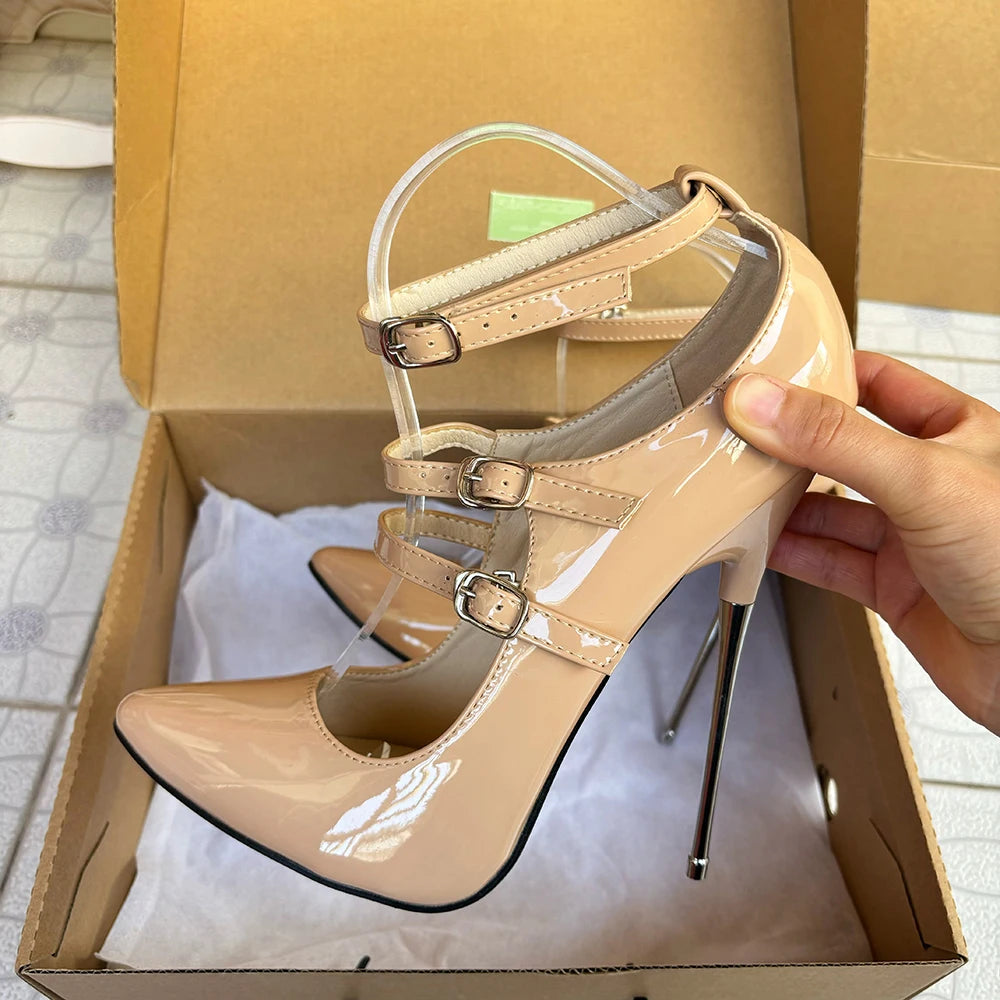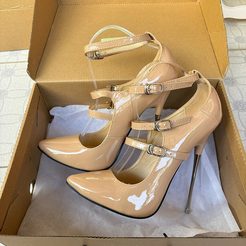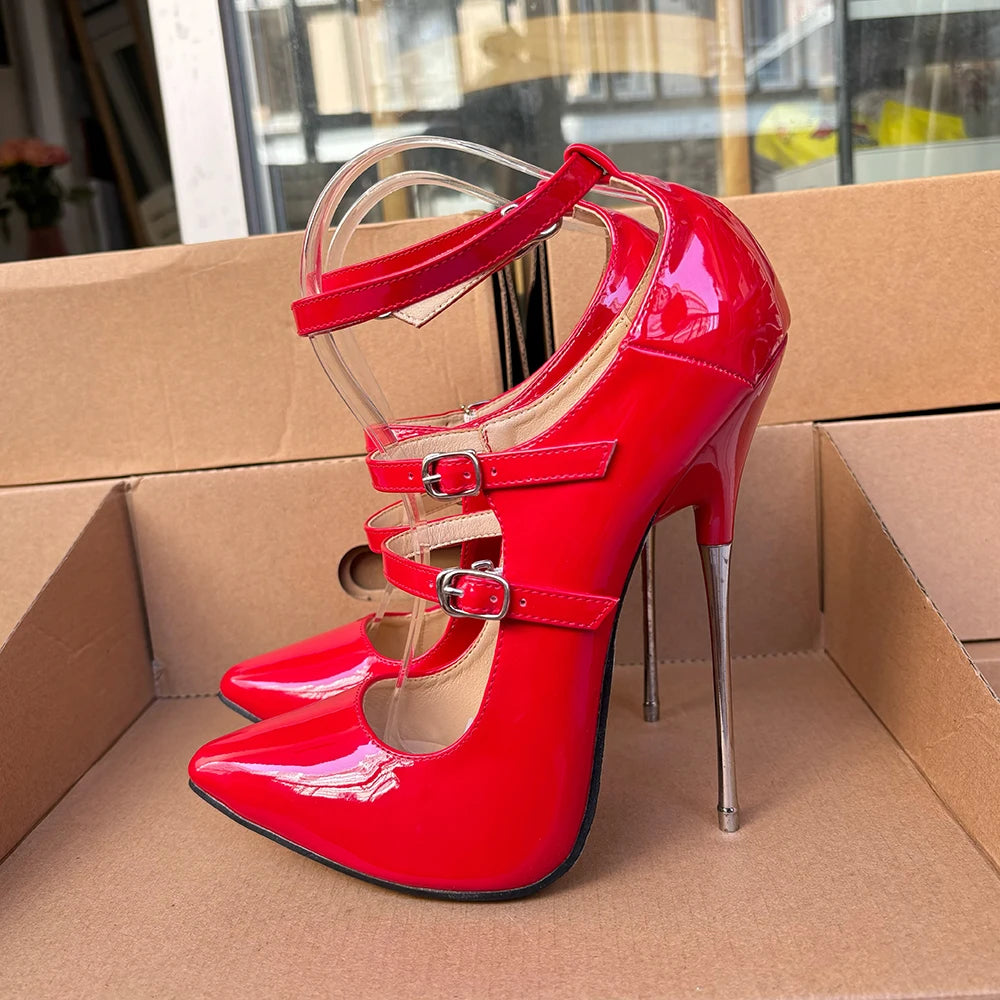 Tacones altos unisex de 16 cm con tiras negras en el tobillo, sexys y fetichistas.