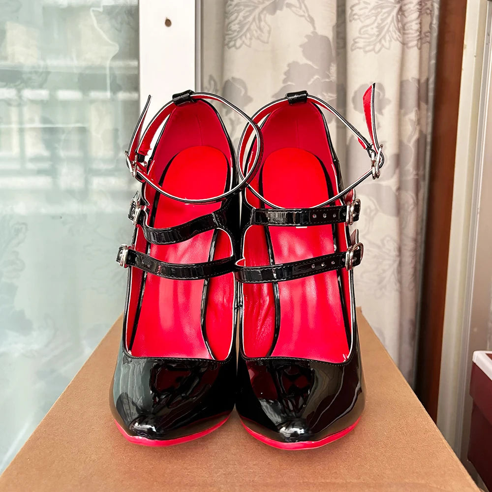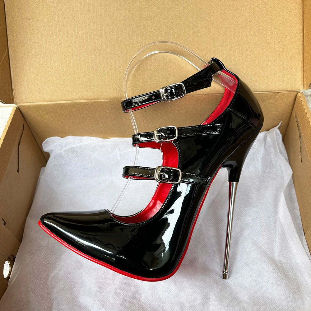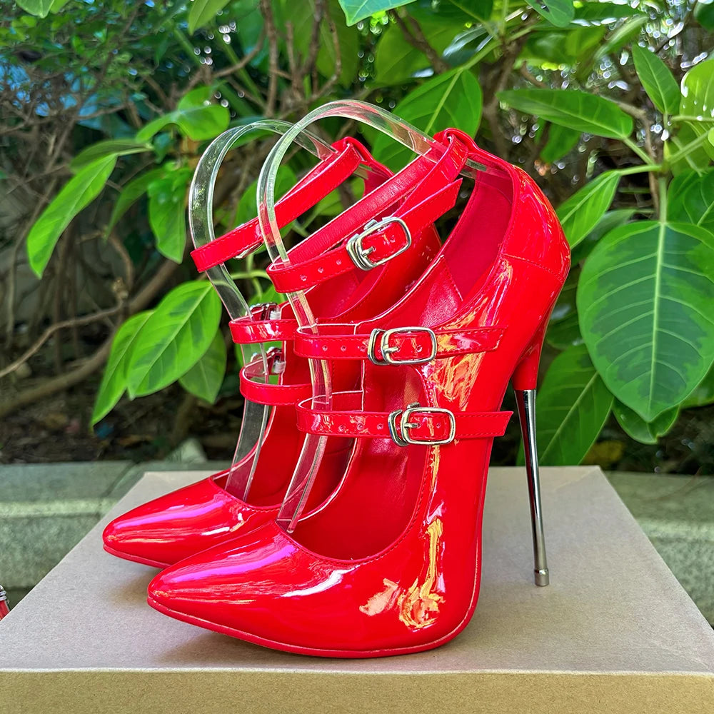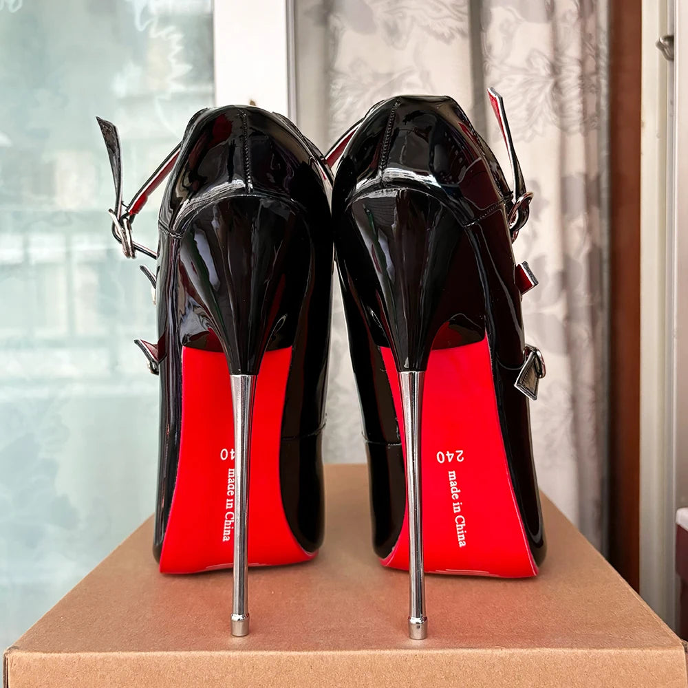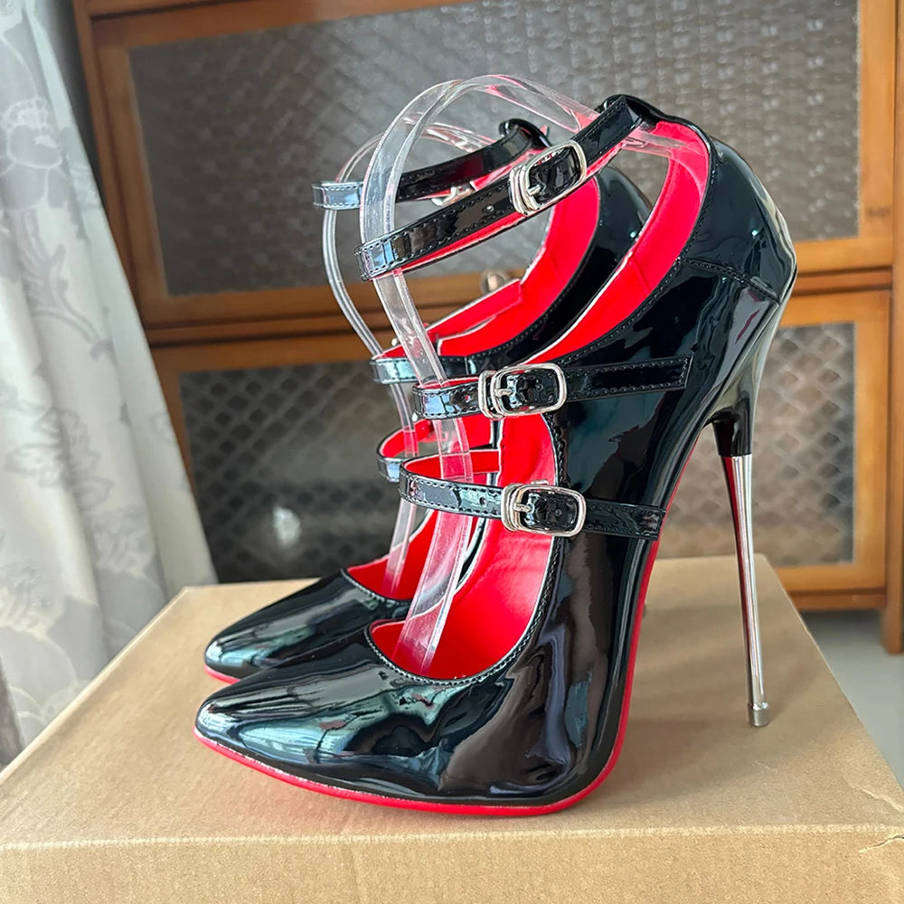 Tacones altos unisex de 16 cm con tiras negras en el tobillo y tacón fetiche rojo sexy