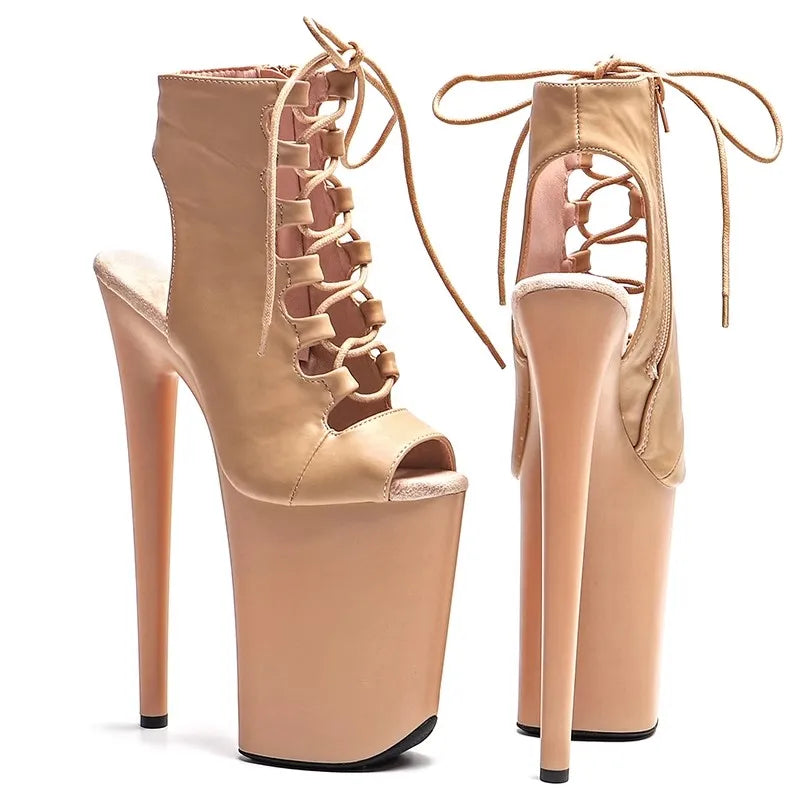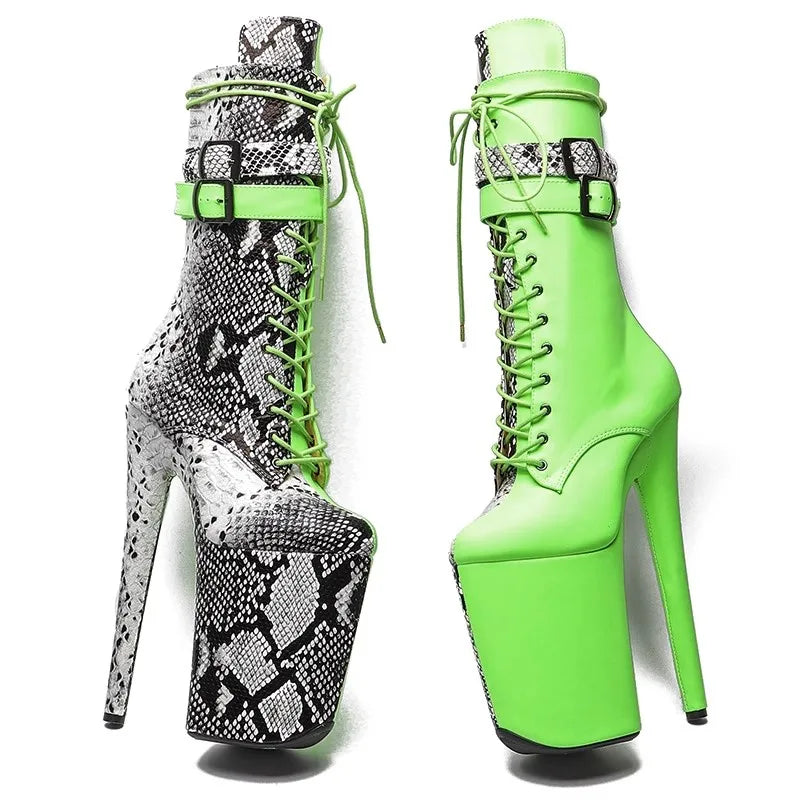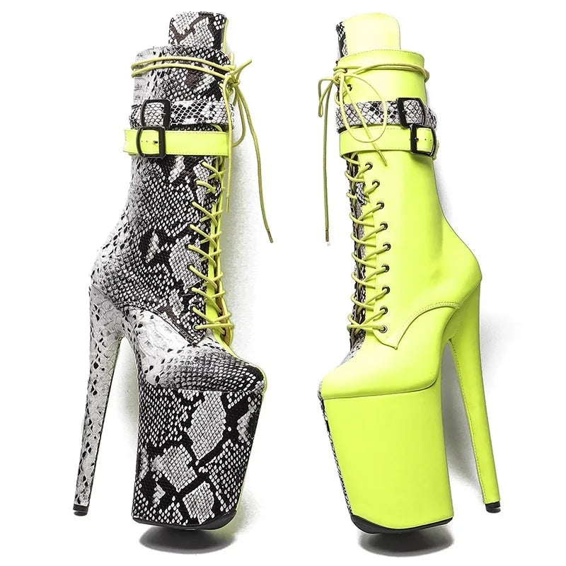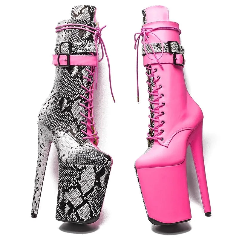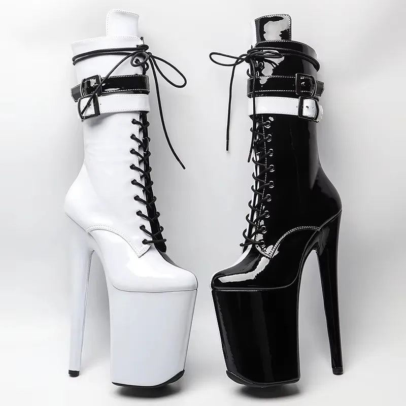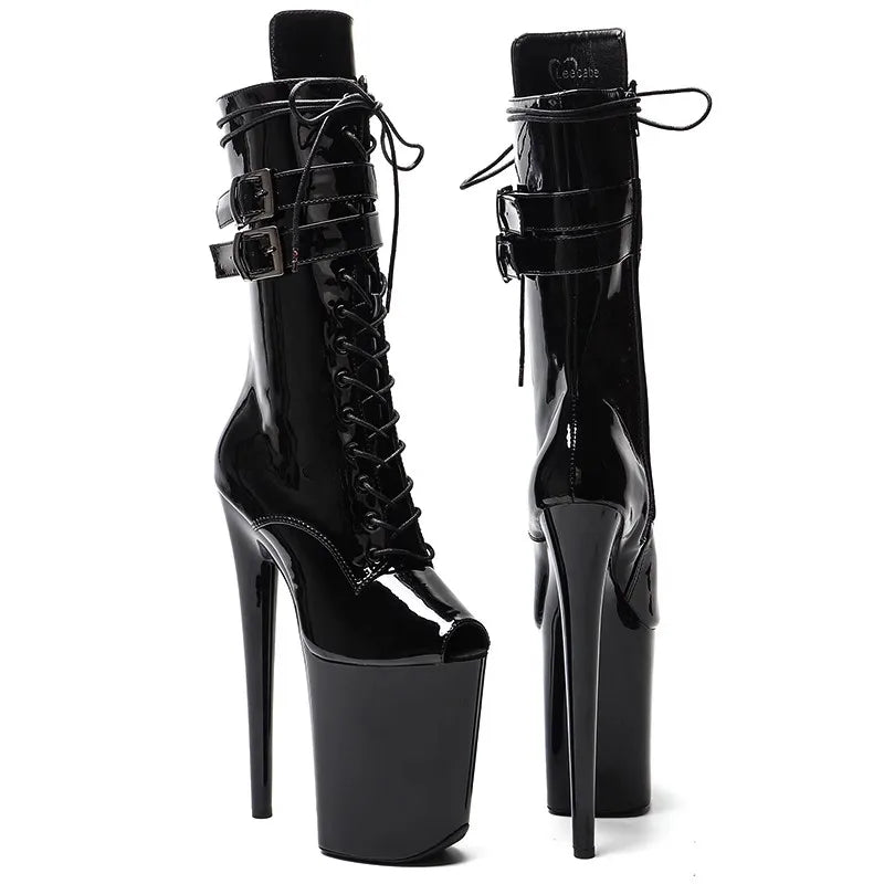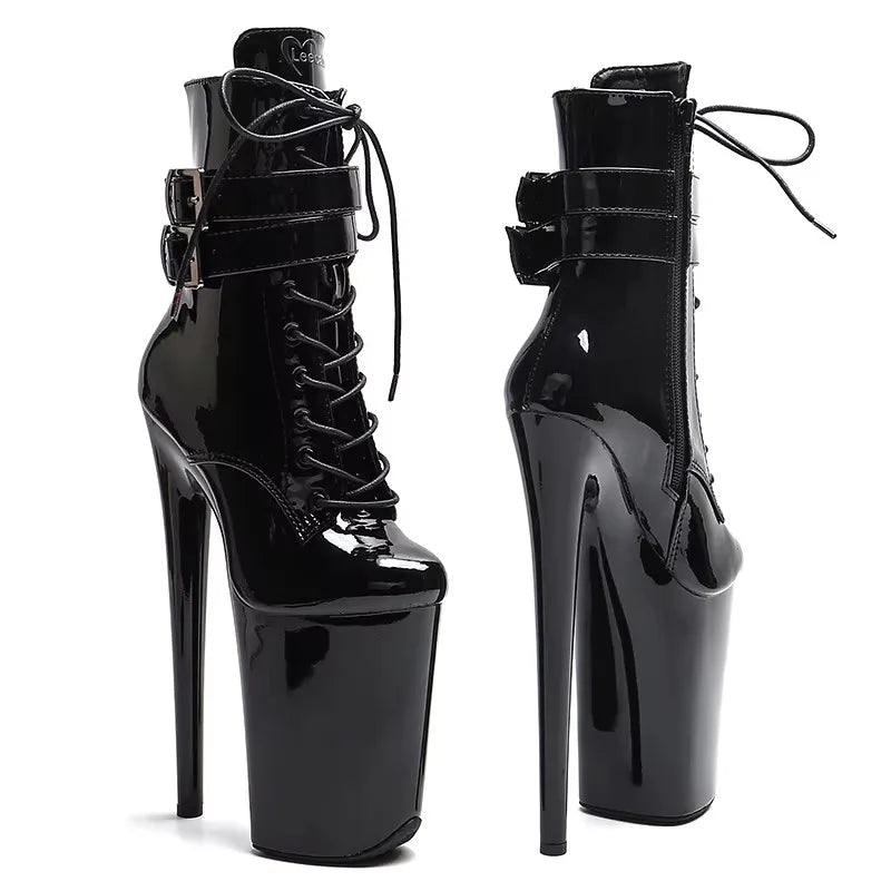 Nuevas botas sexis de 23 CM/9 pulgadas con parte superior de PU patentada, tacones altos, plataforma, tacón de stripper, zapatos de baile en barra, botas de tobillo modernas
