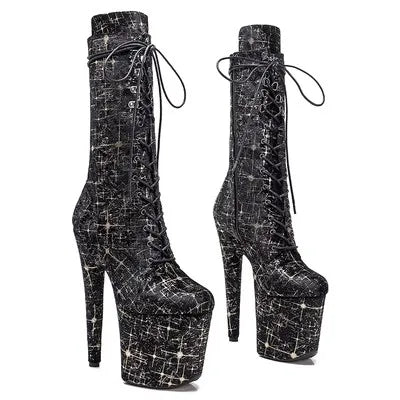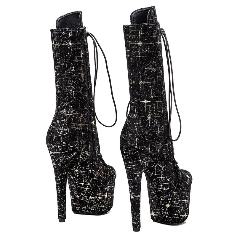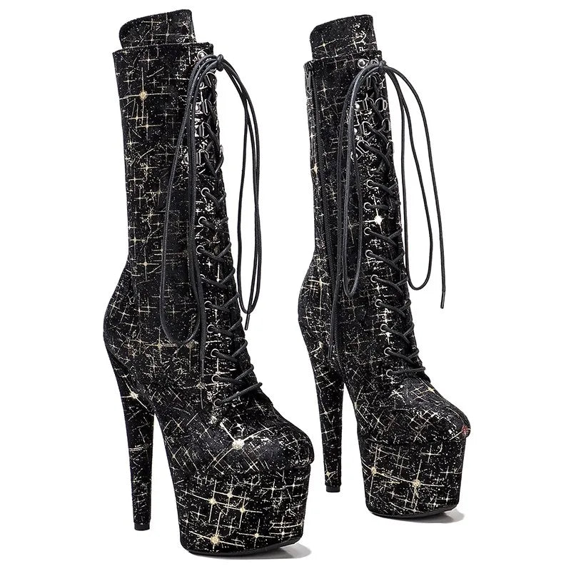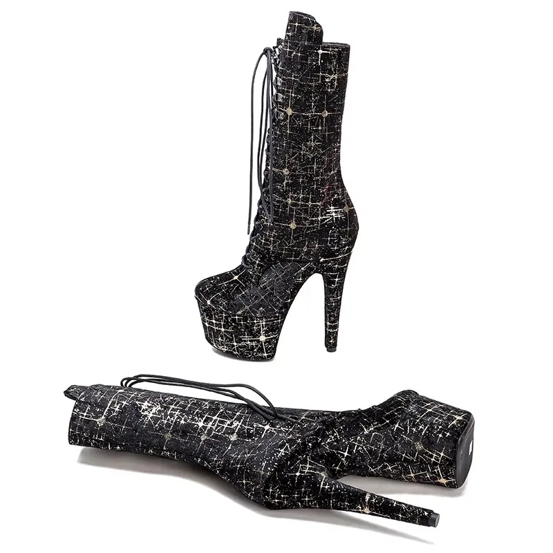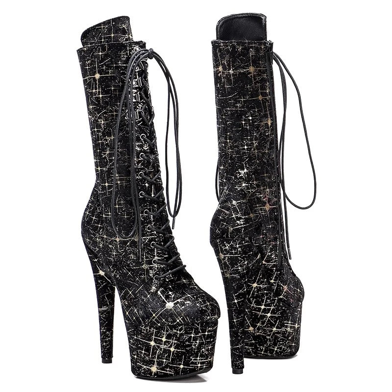 Botas modernas de tacón alto con plataforma para mujer, de 17 cm/7 pulgadas, con parte superior de PU negra, para baile en barra