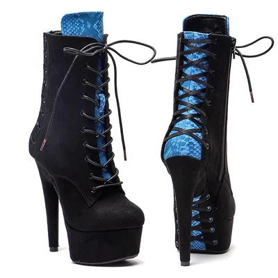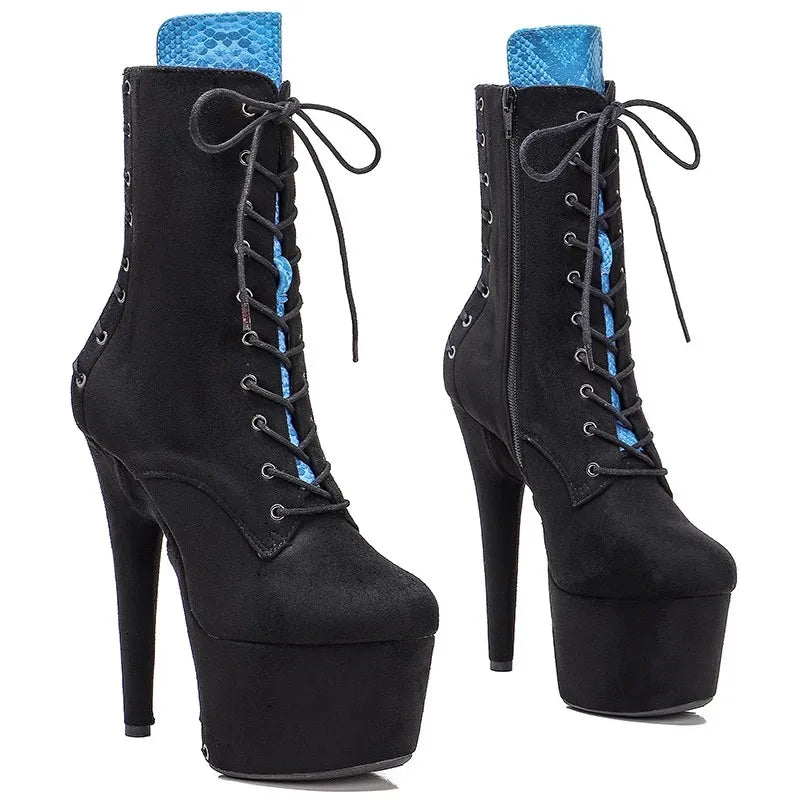 Botas modernas de tacón alto con plataforma para mujer, de 17 cm/7 pulgadas, con parte superior de gamuza negra, para baile en barra