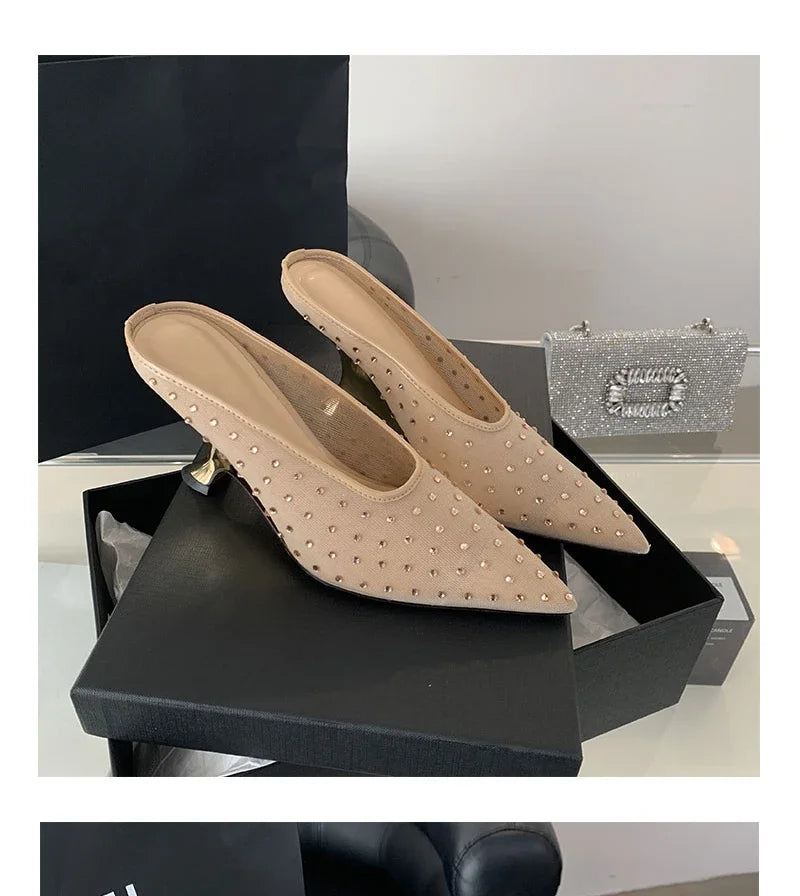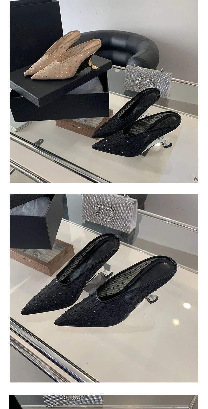 Zapatillas de tacón alto con cuña de malla de cristal de diseñador para mujer, elegantes, de punta estrecha y poco profunda, para fiesta, zapatos tipo mula para mujer