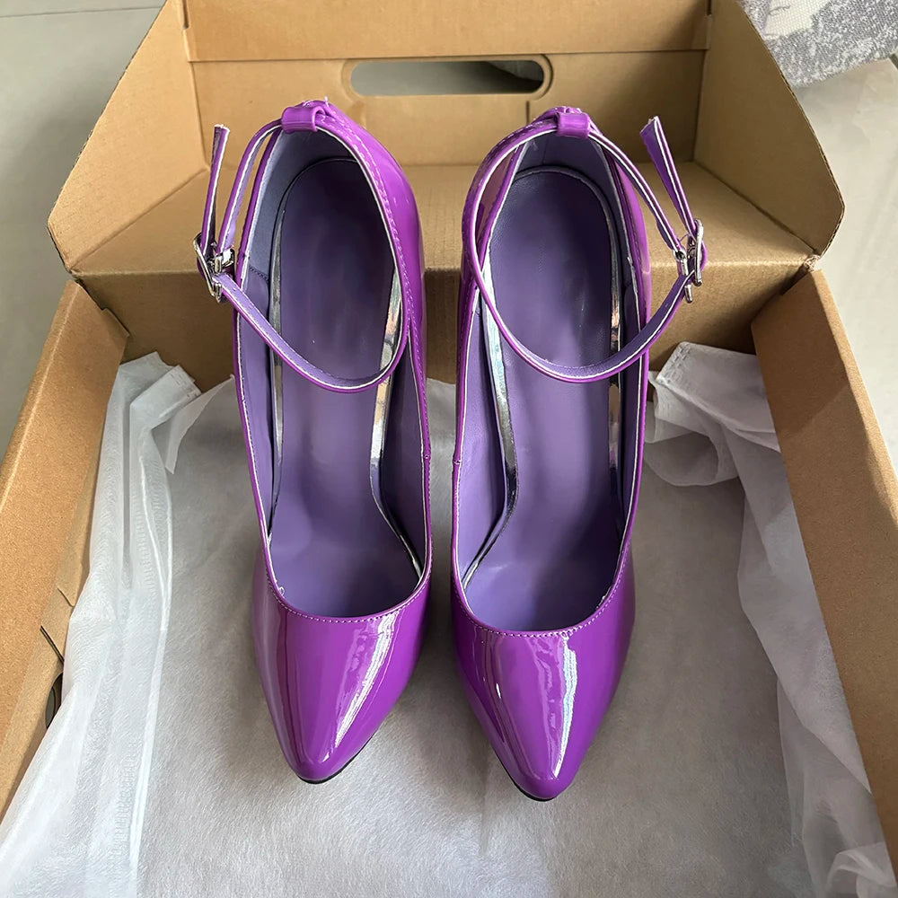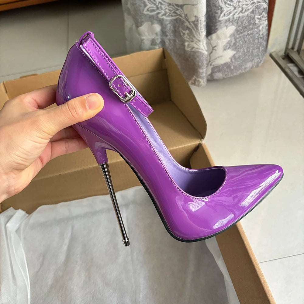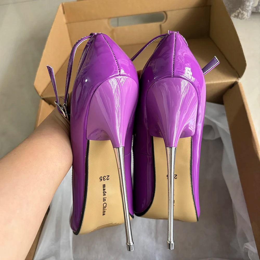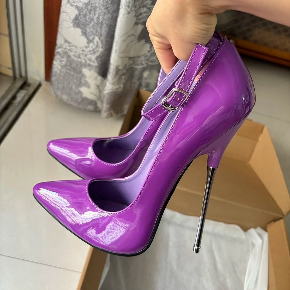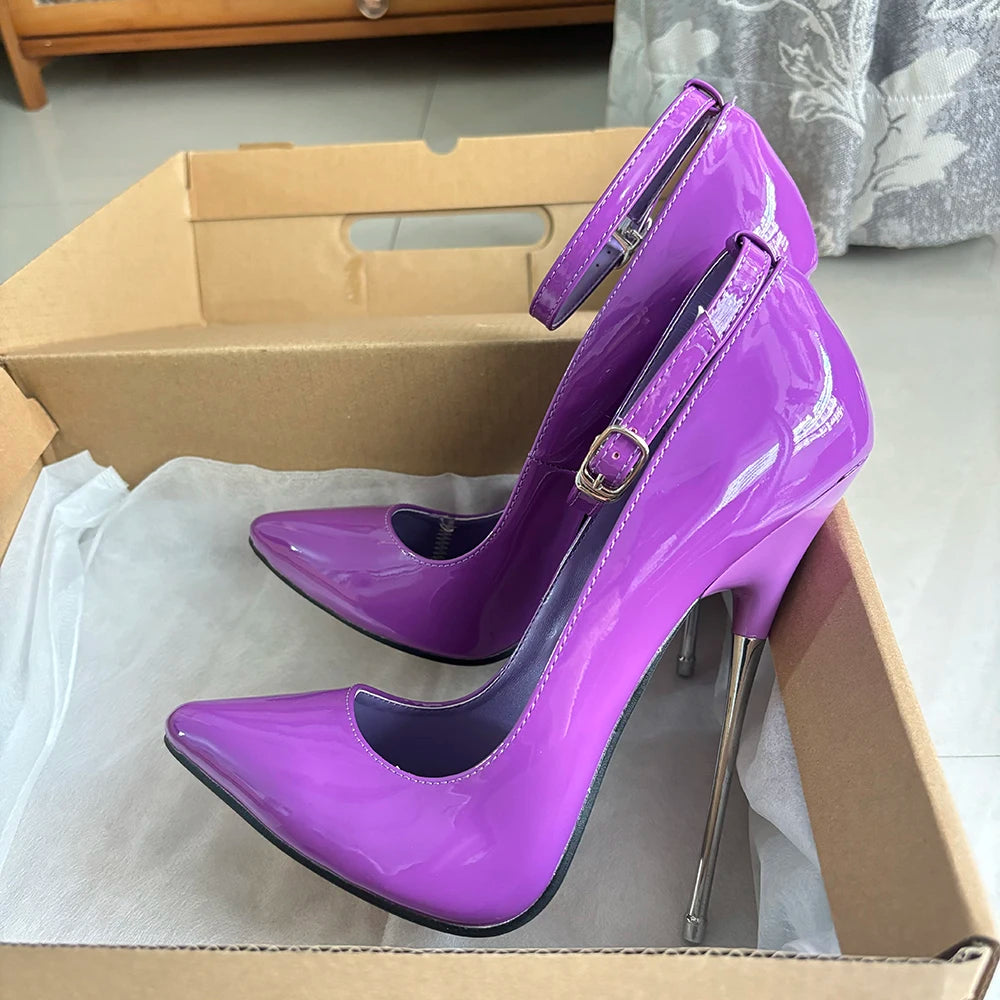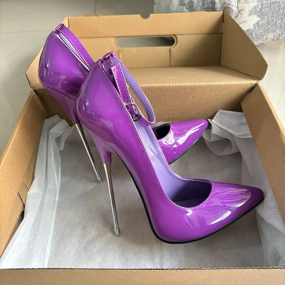 Zapatos de tacón alto de metal extremo de 16 cm, personalizables, sexys, morados, con tiras en el tobillo, modelo fetiche, fotografía.
