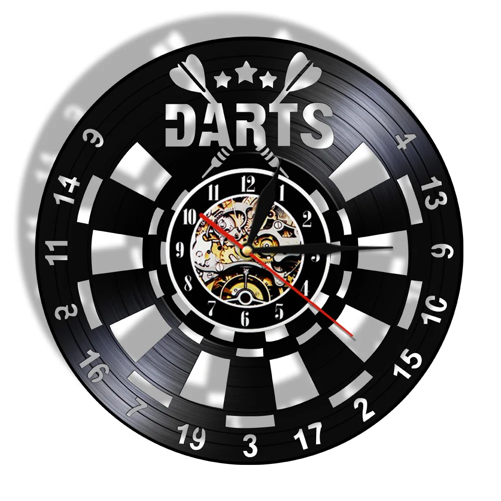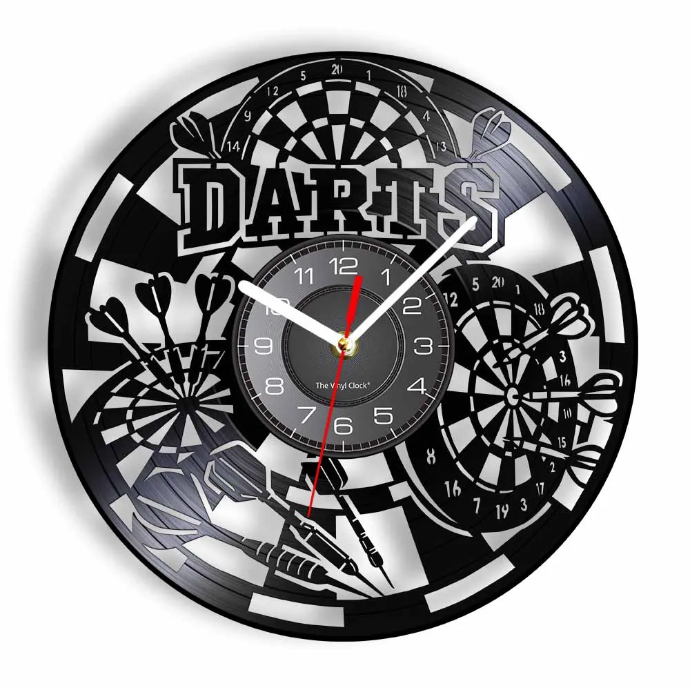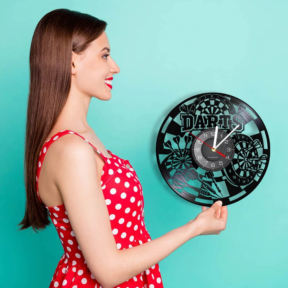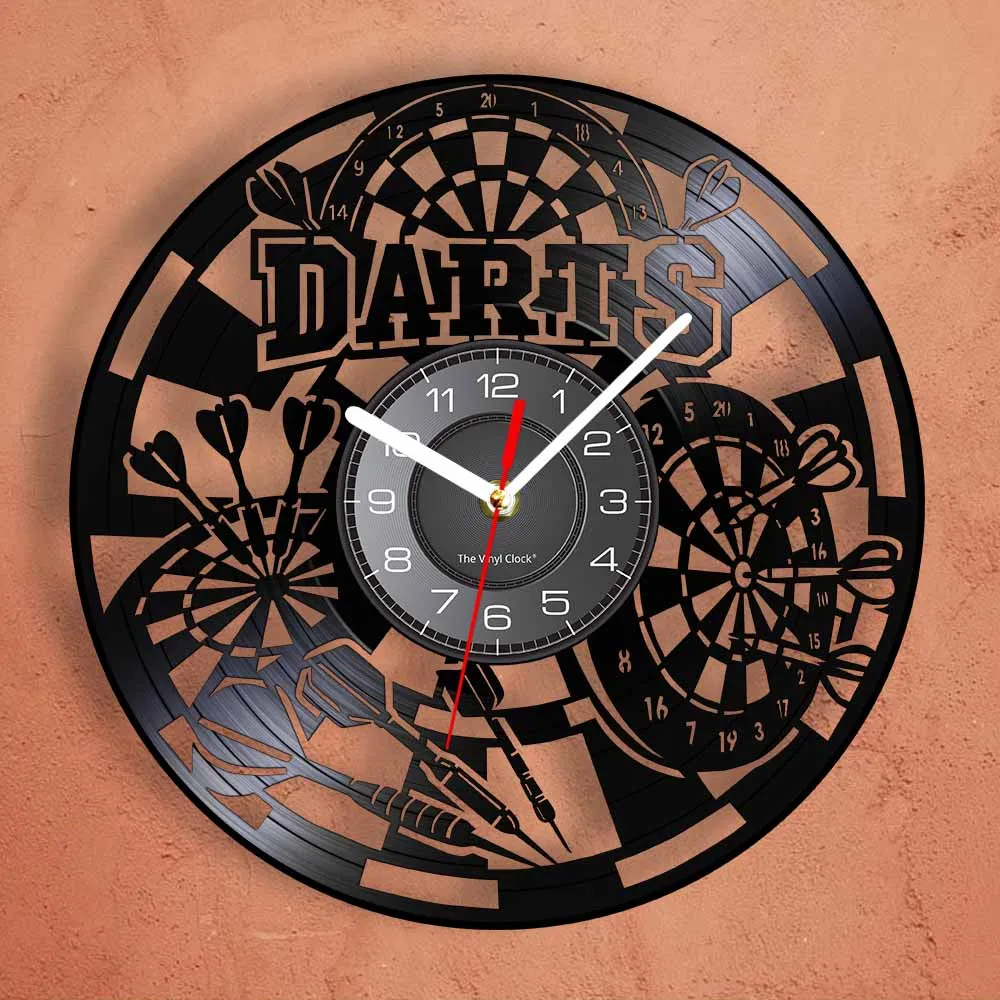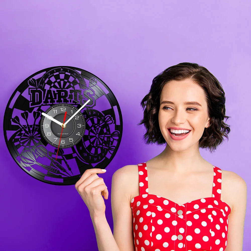 Reloj de pared de vinilo retro con diseño de dardos para pub, cueva de hombre, sala de juegos, decoración, reloj retro, tablero de dardos, bar, club nocturno, manualidades