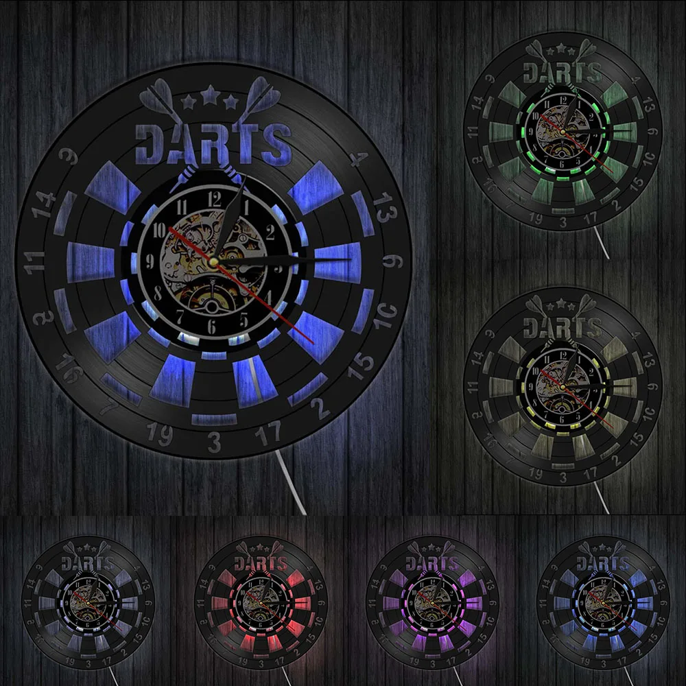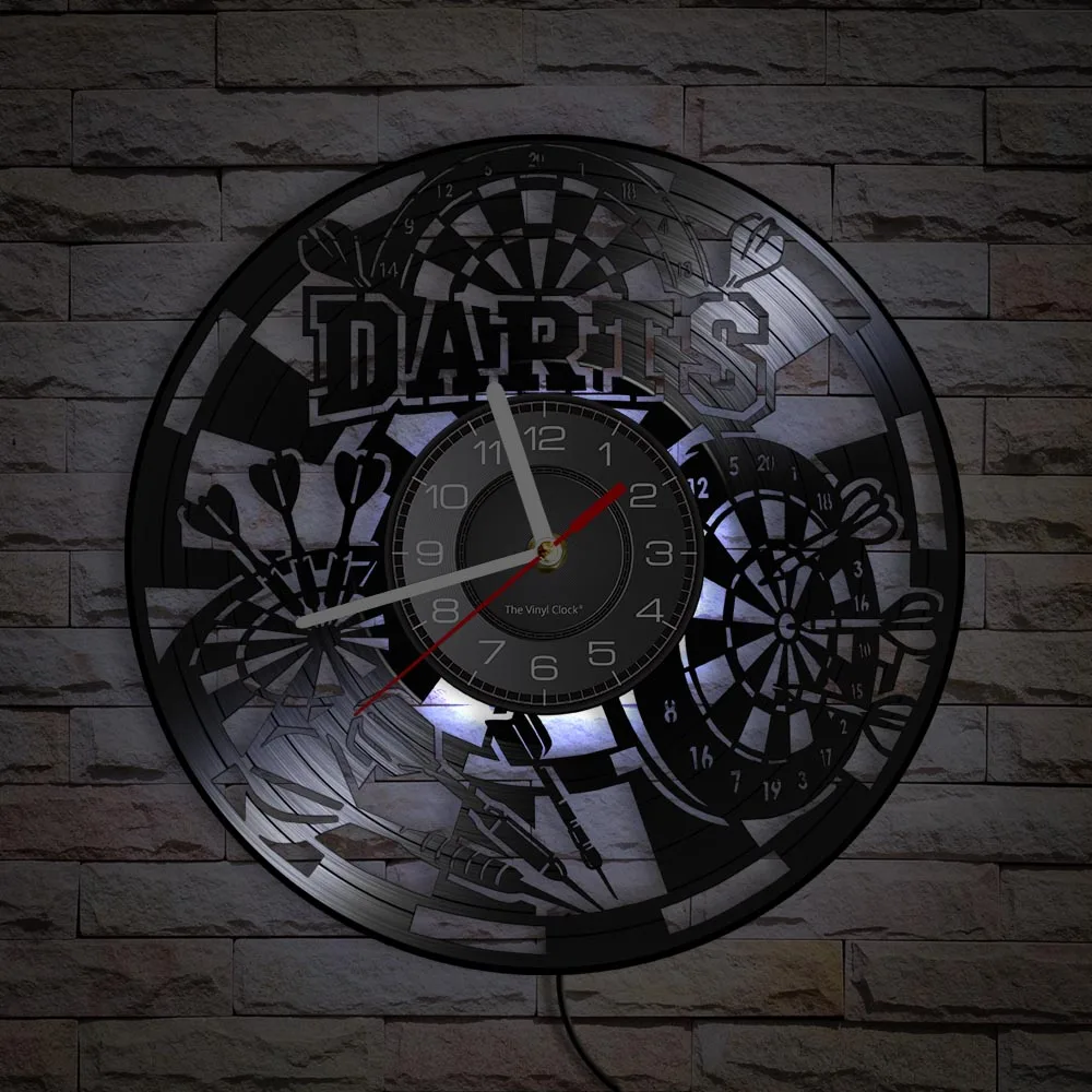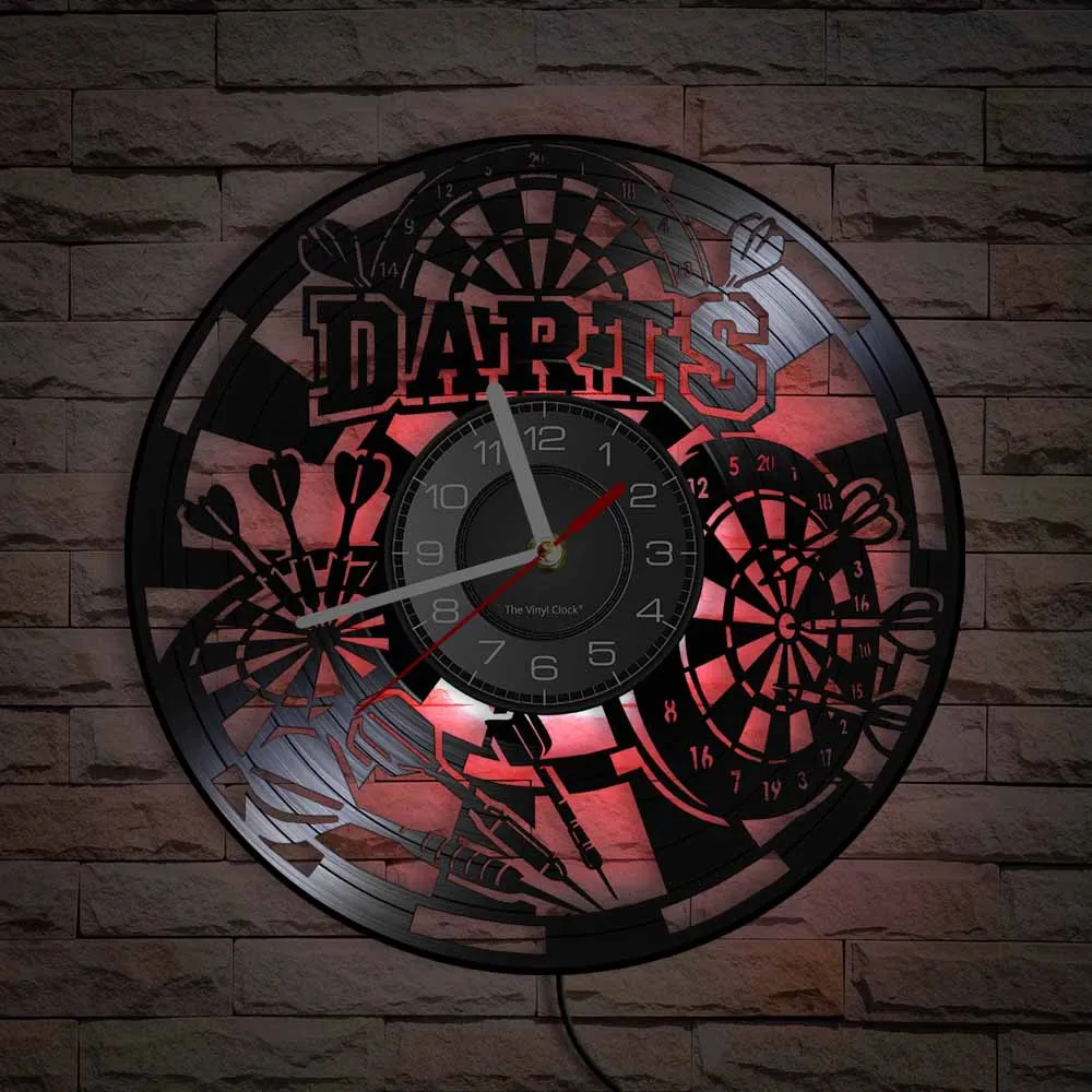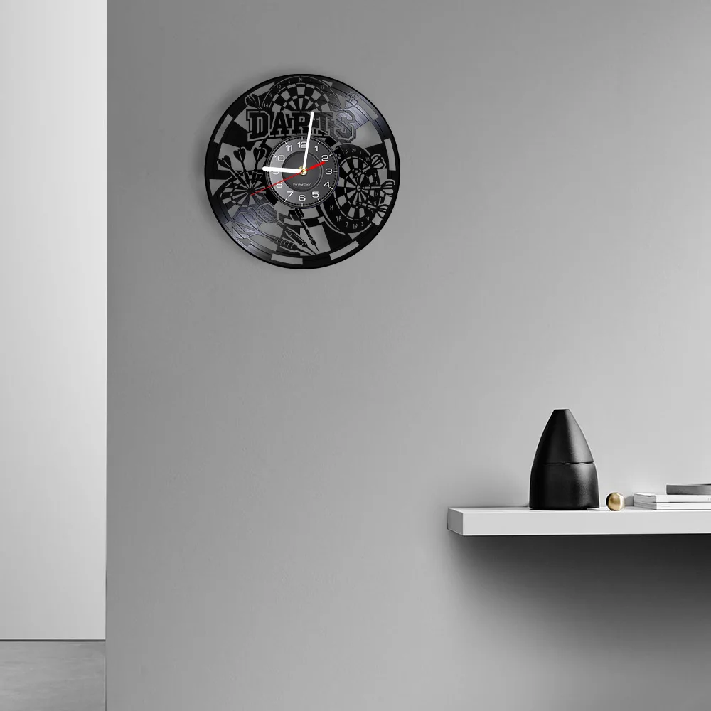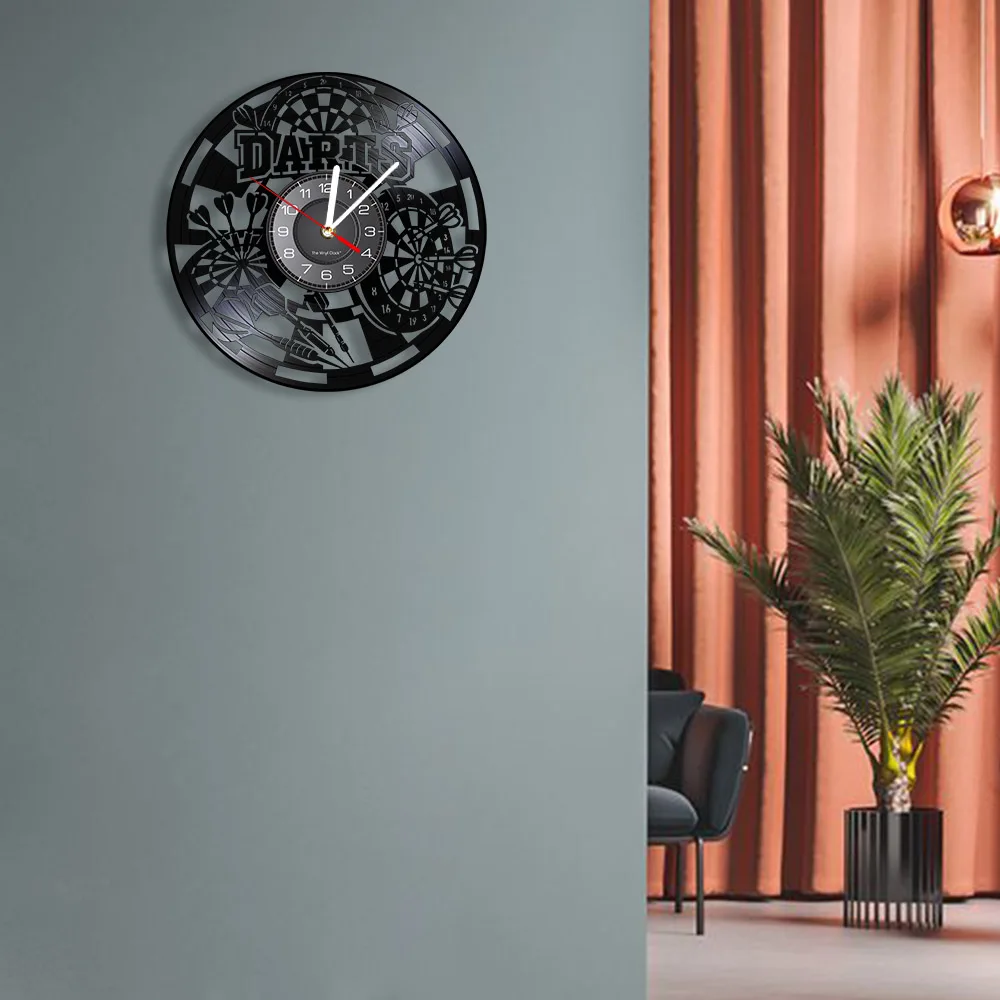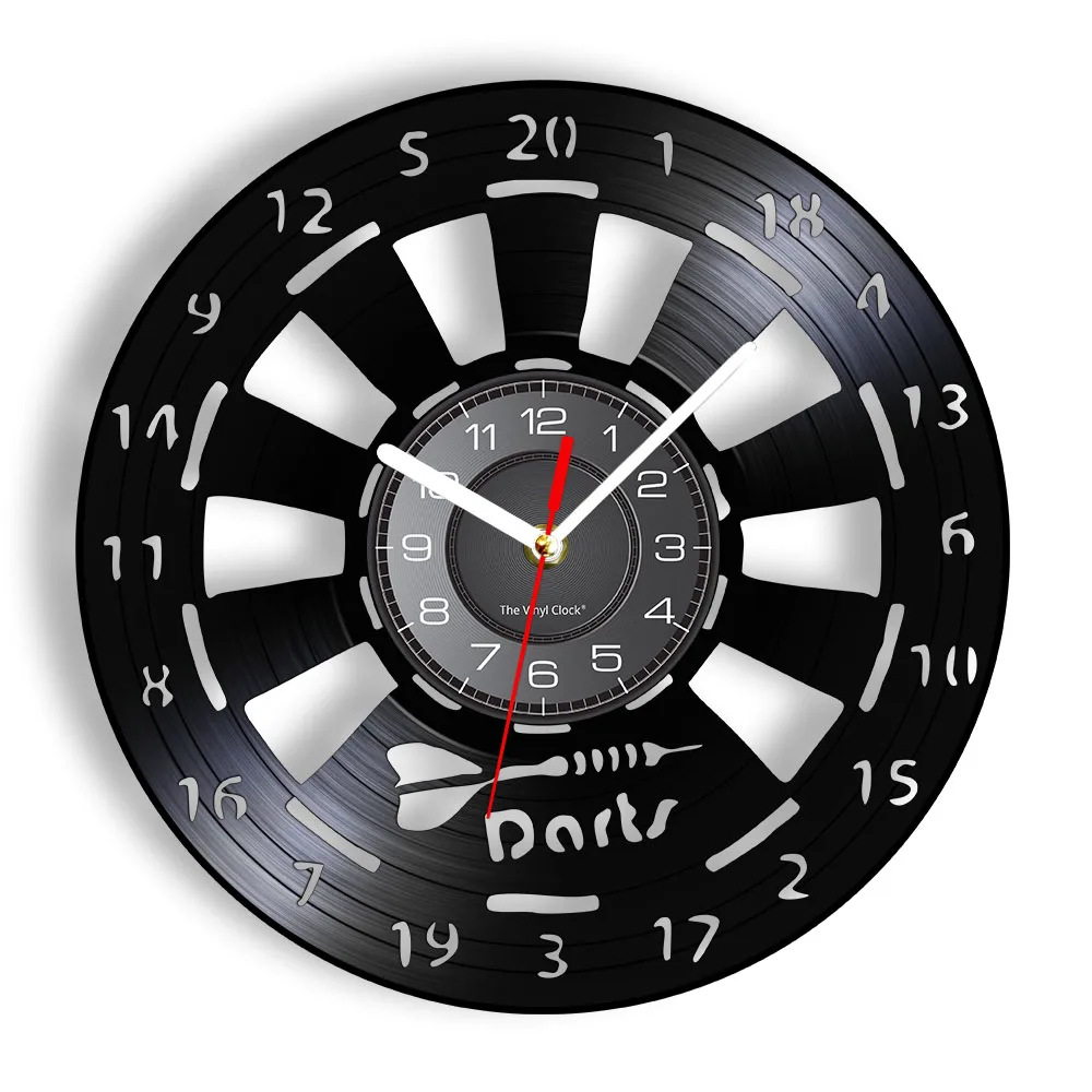 Reloj de pared de vinilo retro con diseño de dardos para pub, cueva de hombre, sala de juegos, decoración, reloj retro, tablero de dardos, bar, club nocturno, manualidades
