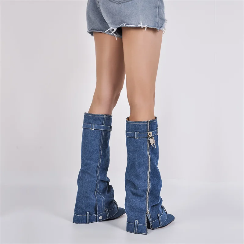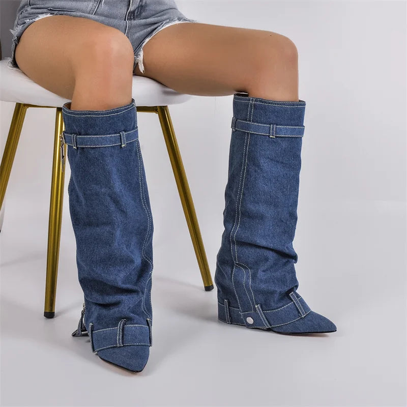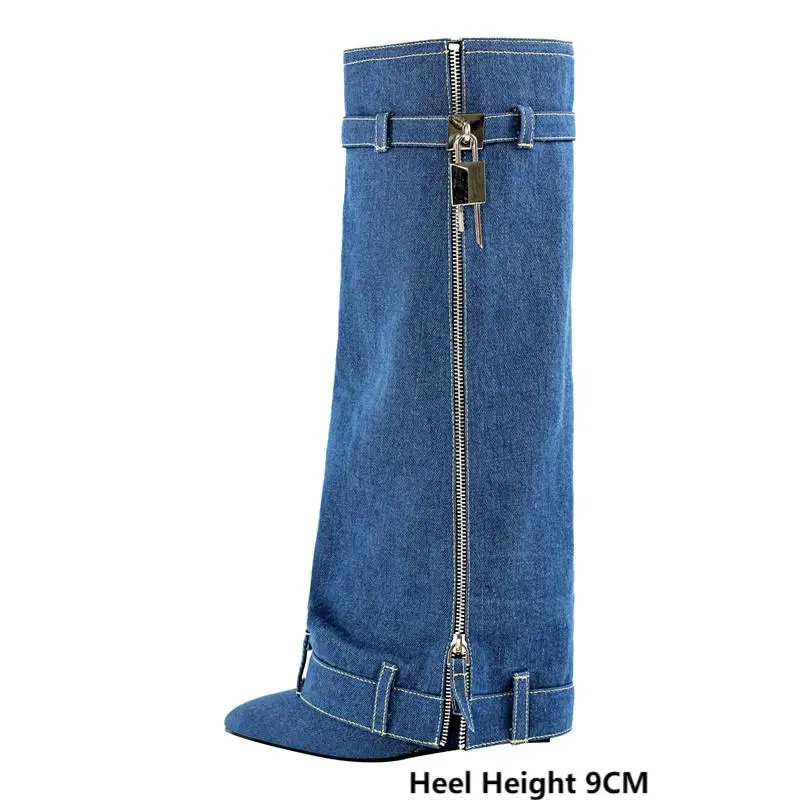 Botas vaqueras con cierre de tiburón y cuña con pliegues hasta la rodilla y tacón alto hechas a mano para mujer
