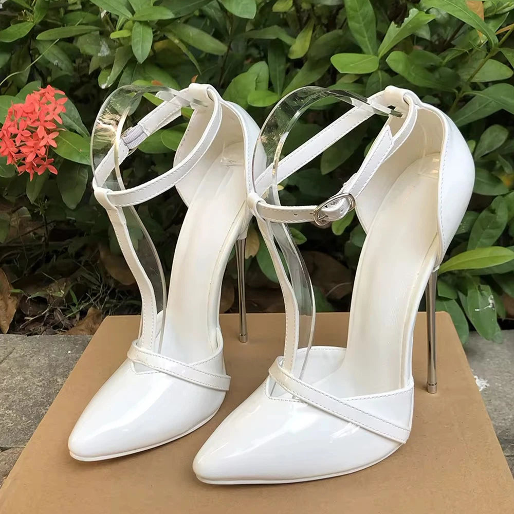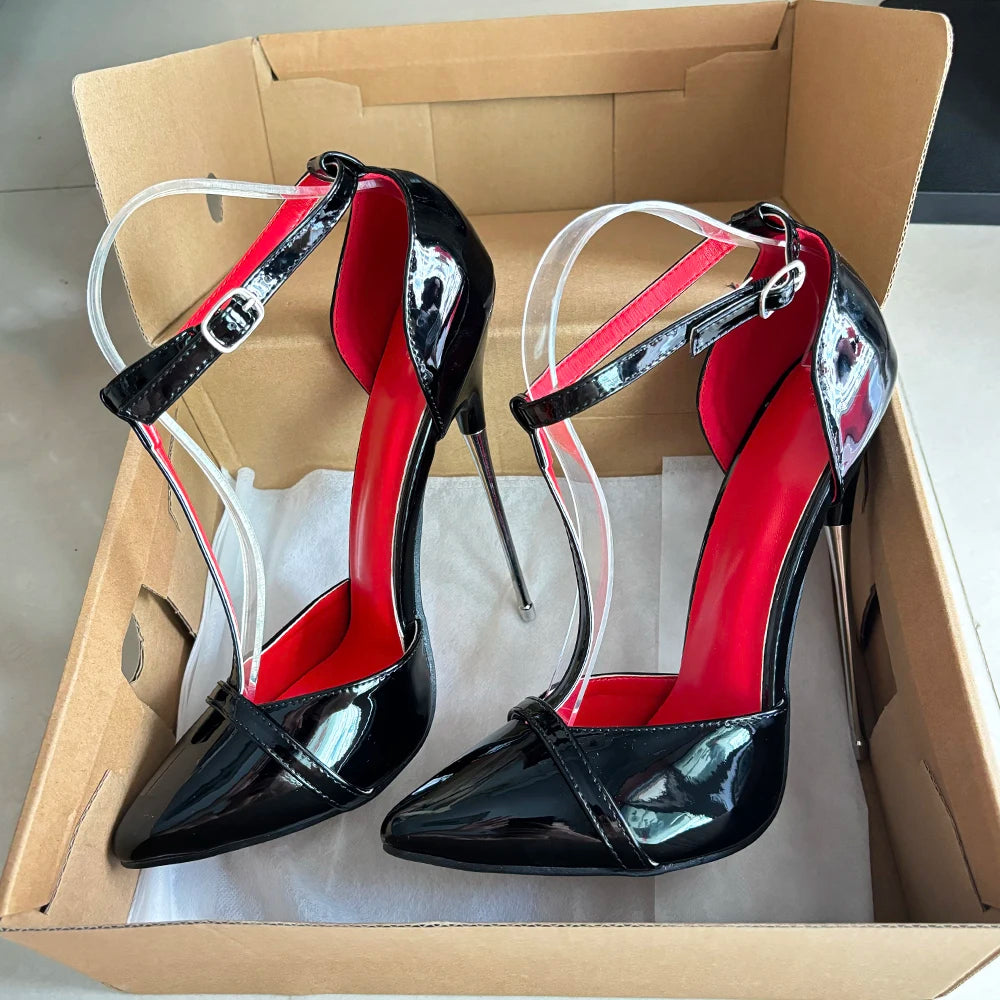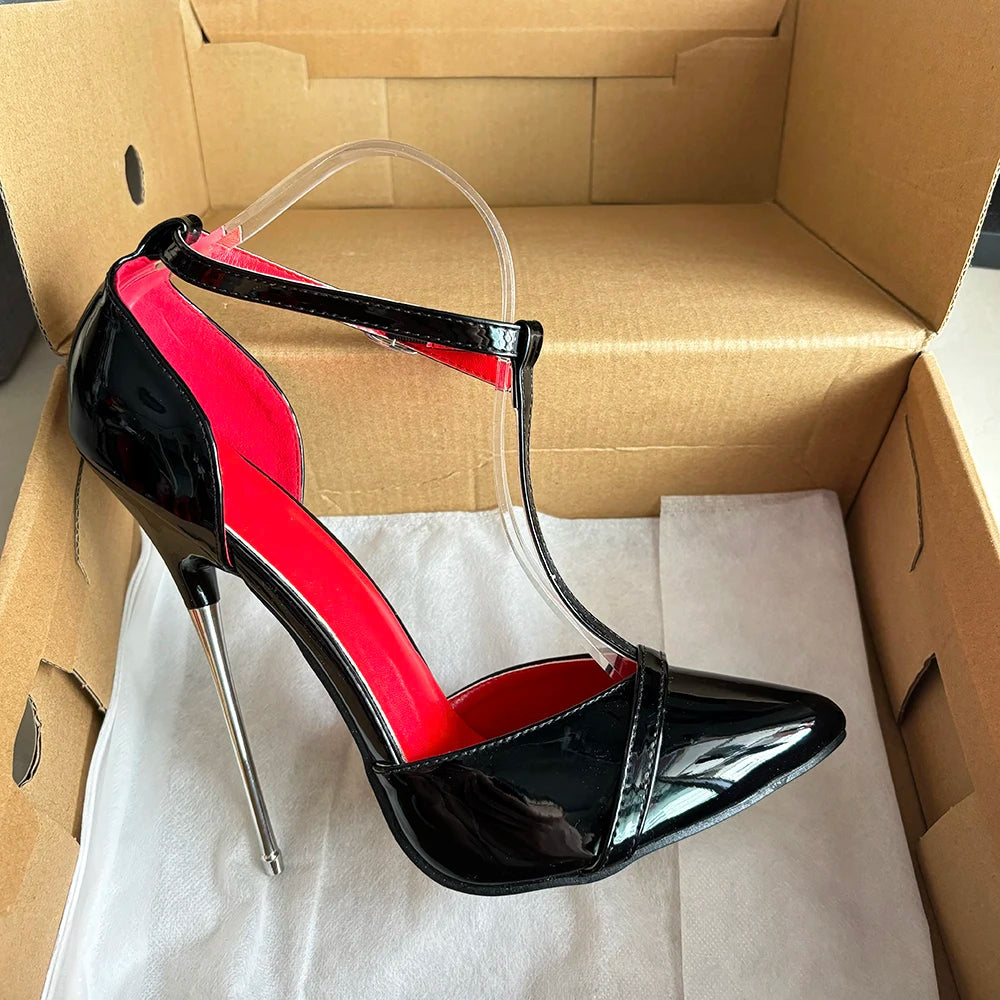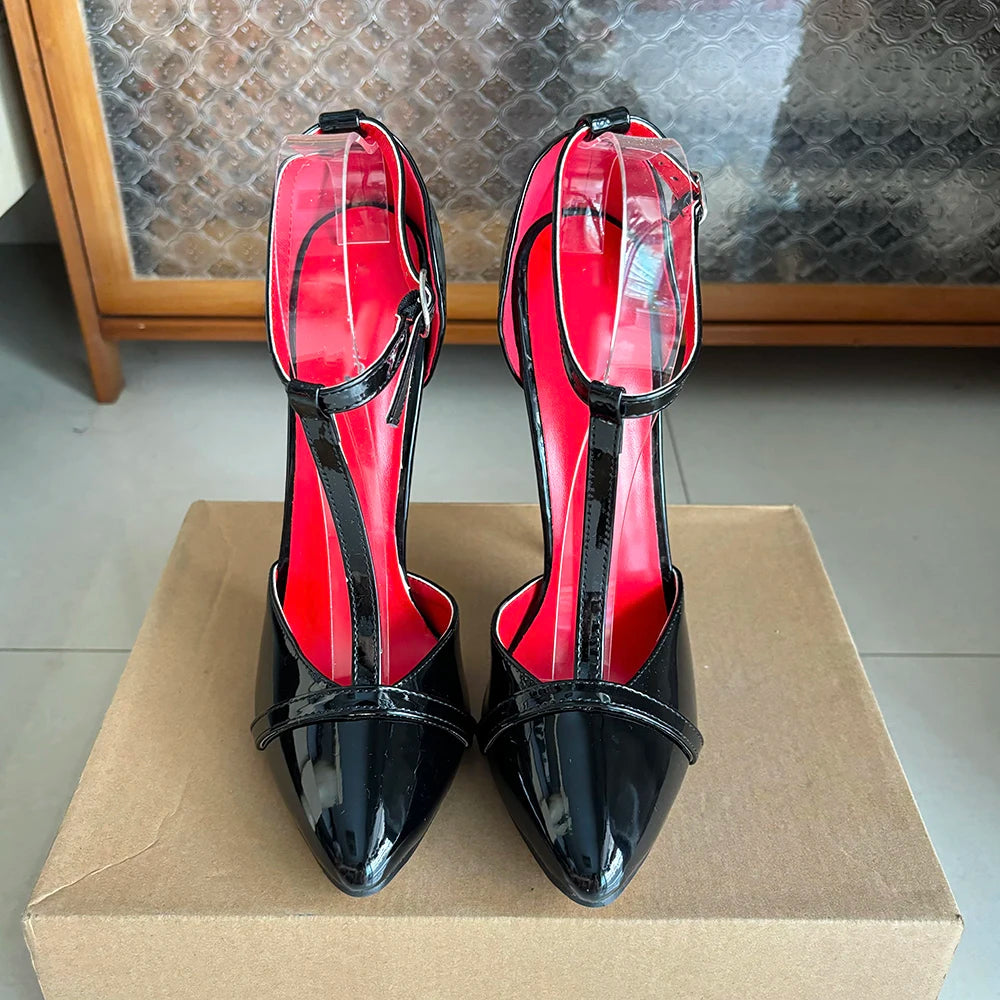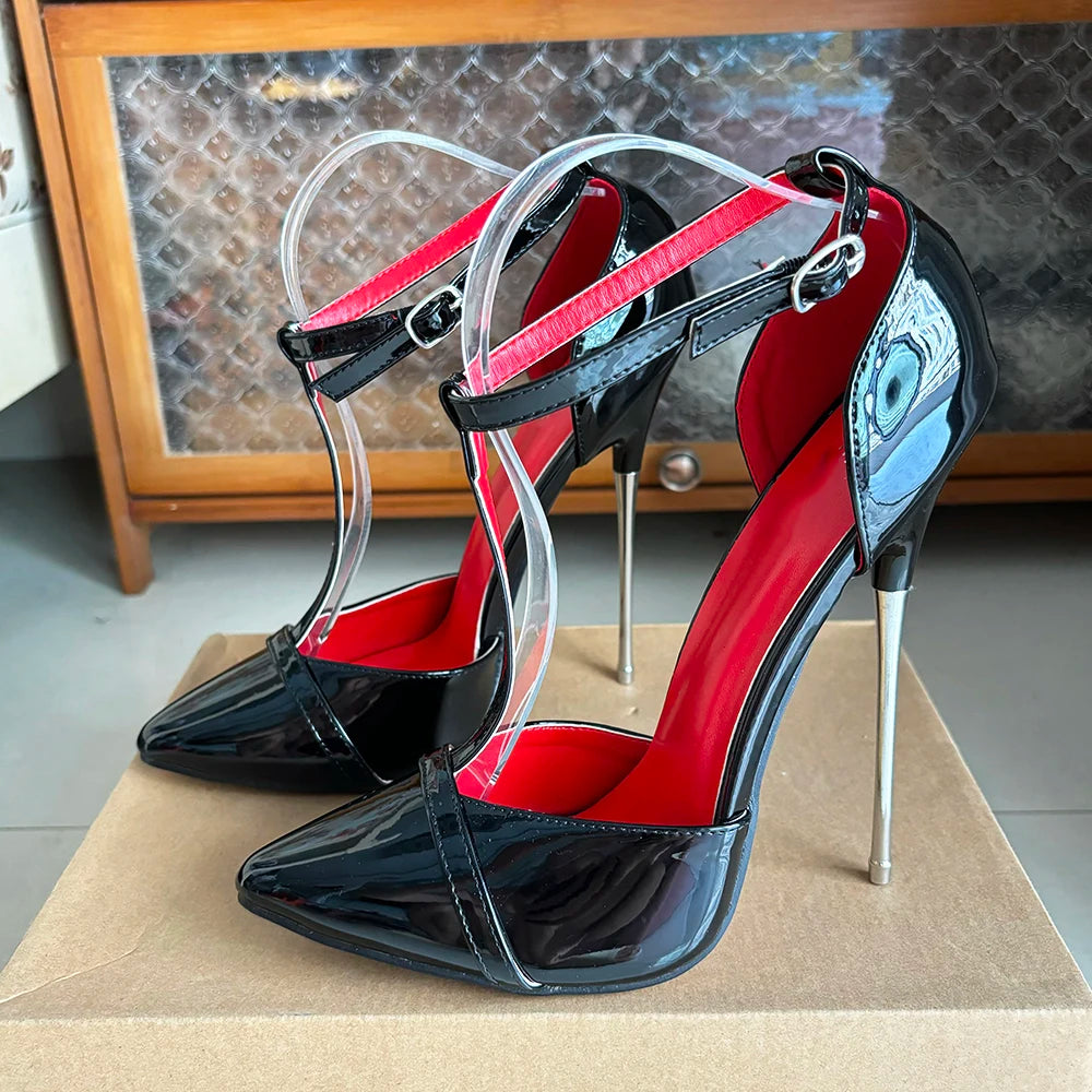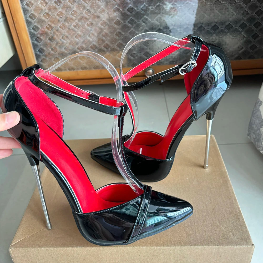 Zapatos de tacón alto de metal de 16 cm para mujer, sexys, negros y rojos, con tiras en el tobillo, estilo fetiche, tipo T, para drag queen gay.