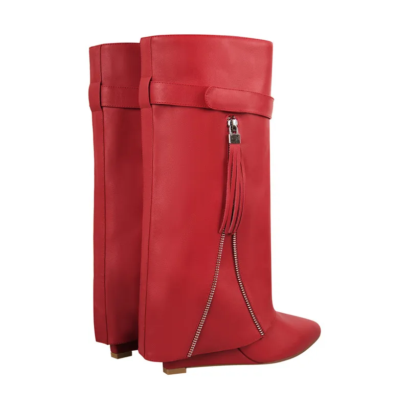 Botas altas hasta la rodilla para mujer, punta puntiaguda, tacón de cuña negro y rojo, botas plegables mate