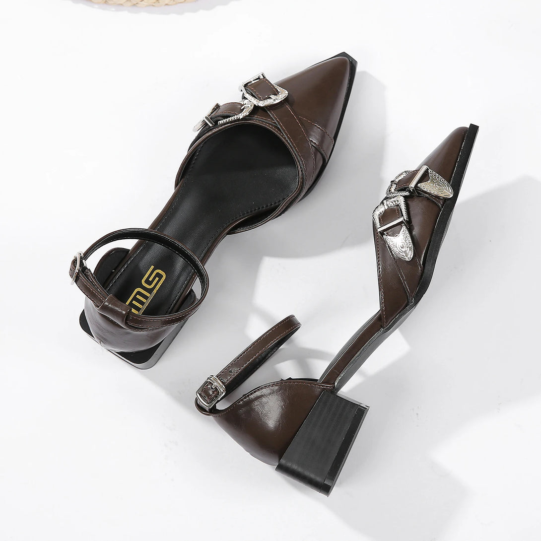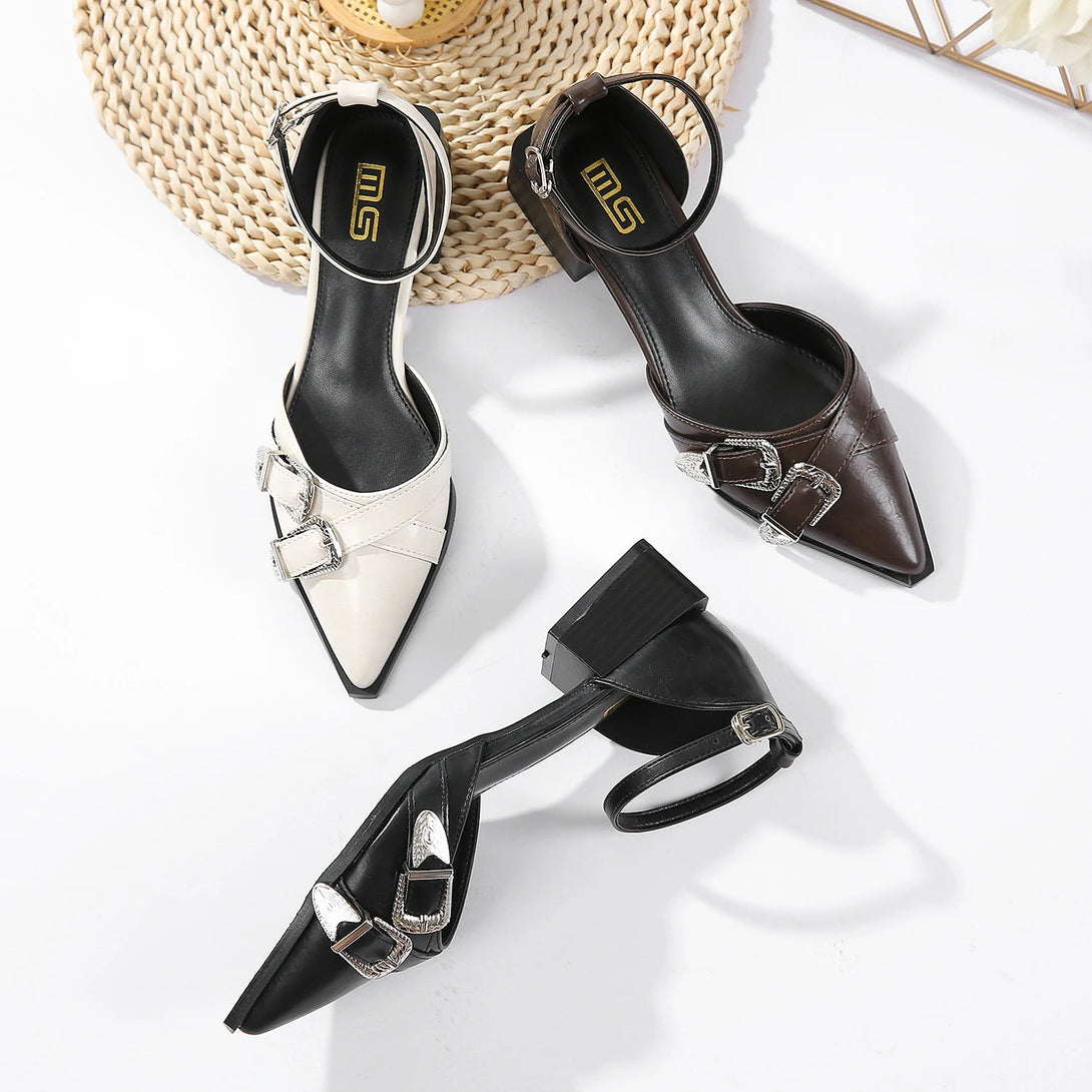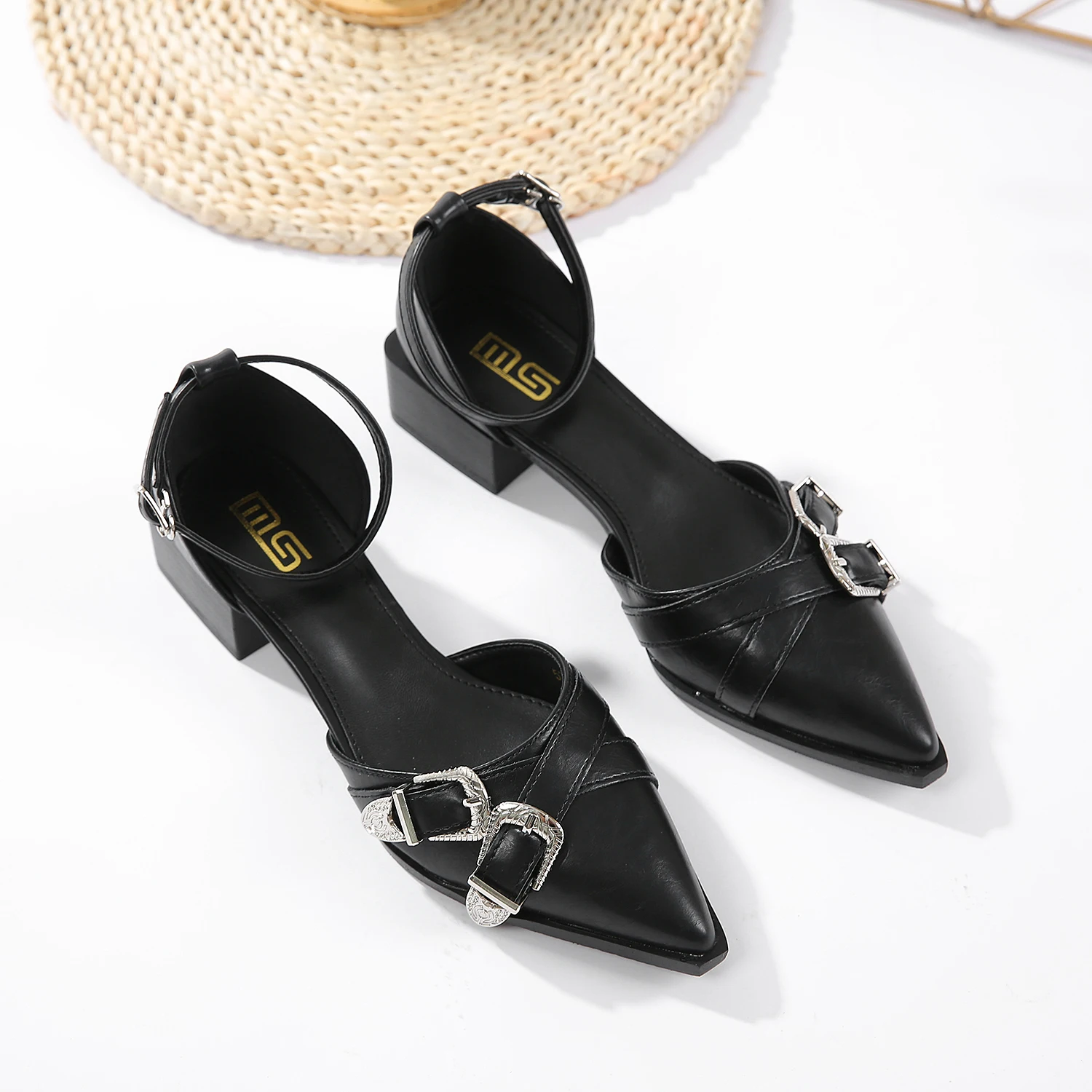 Sandalias de mujer de lujo con tacón bajo y hebilla de cinturón puntiagudo con diamantes de imitación para verano, zapatos de mujer de moda para el trabajo.