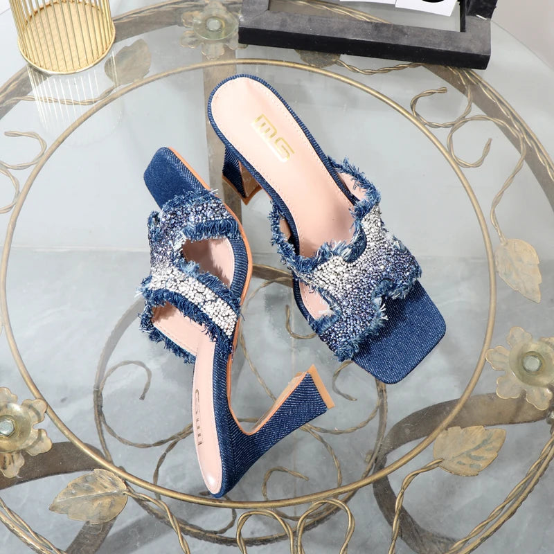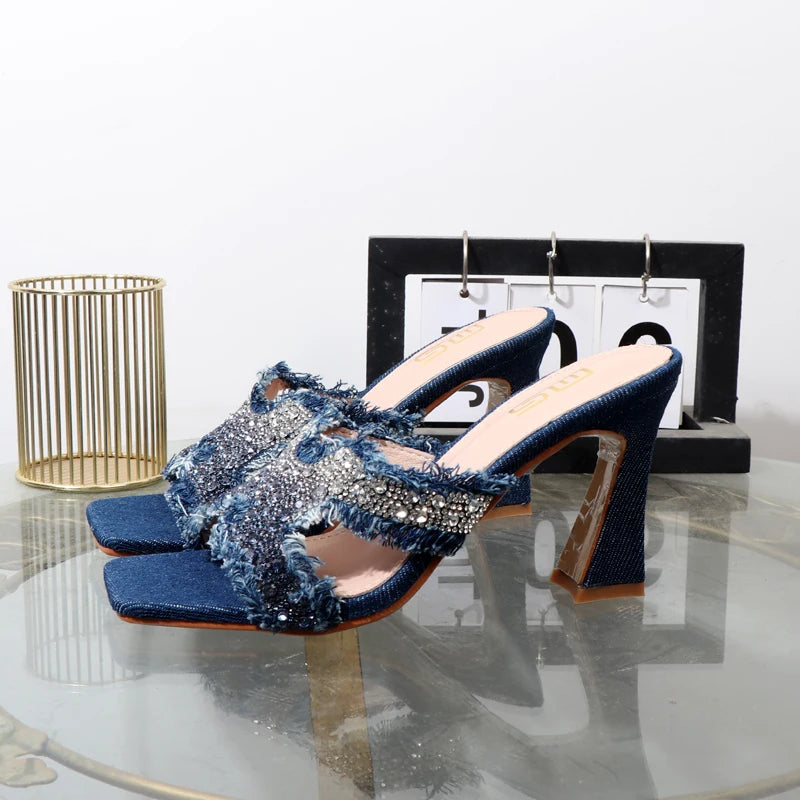 Sandalias de tacón alto con borlas de felpa y diamantes de imitación de lujo para mujer, sandalias azules de verano