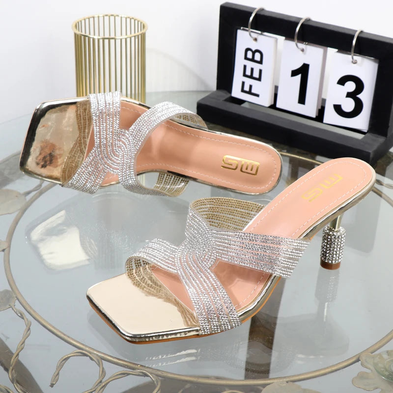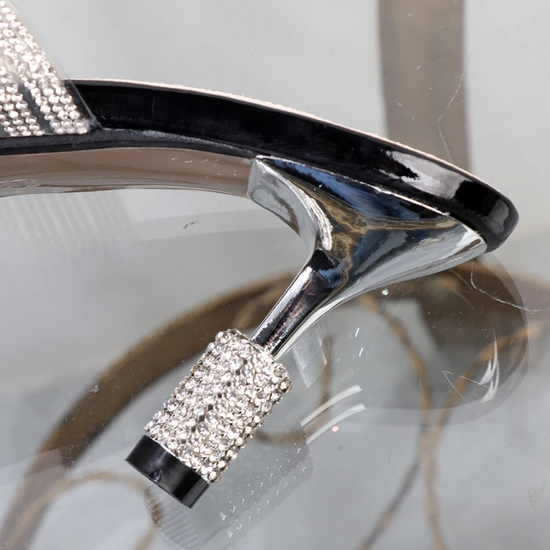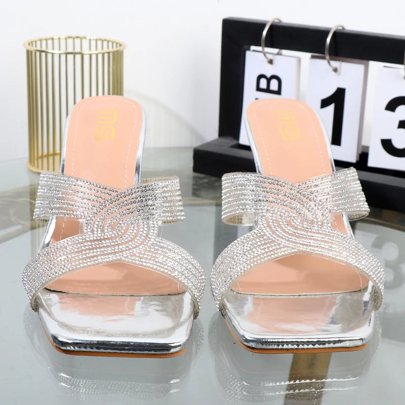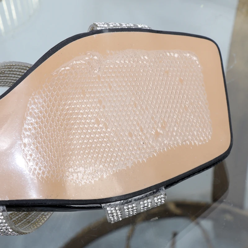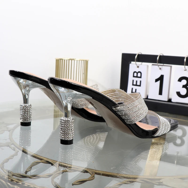 Nuevas zapatillas de mujer sexis con punta abierta, palabra drag, diamantes de imitación, pegamento transparente, tacones finos.