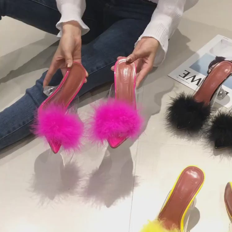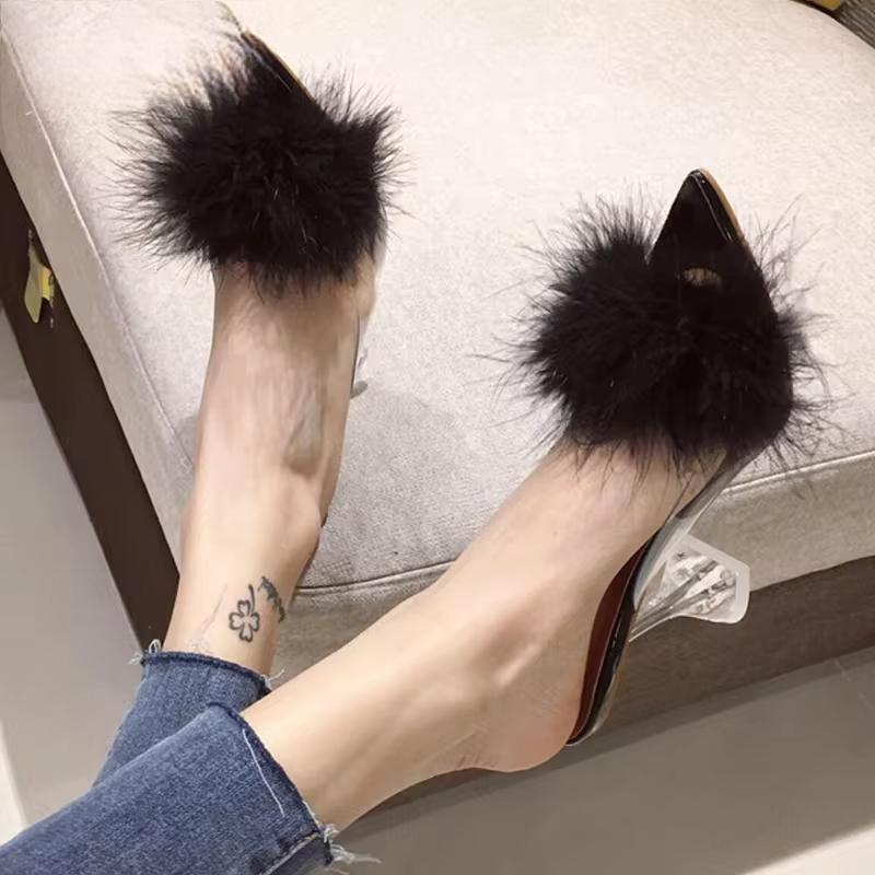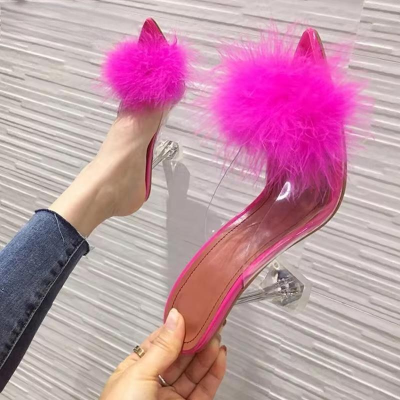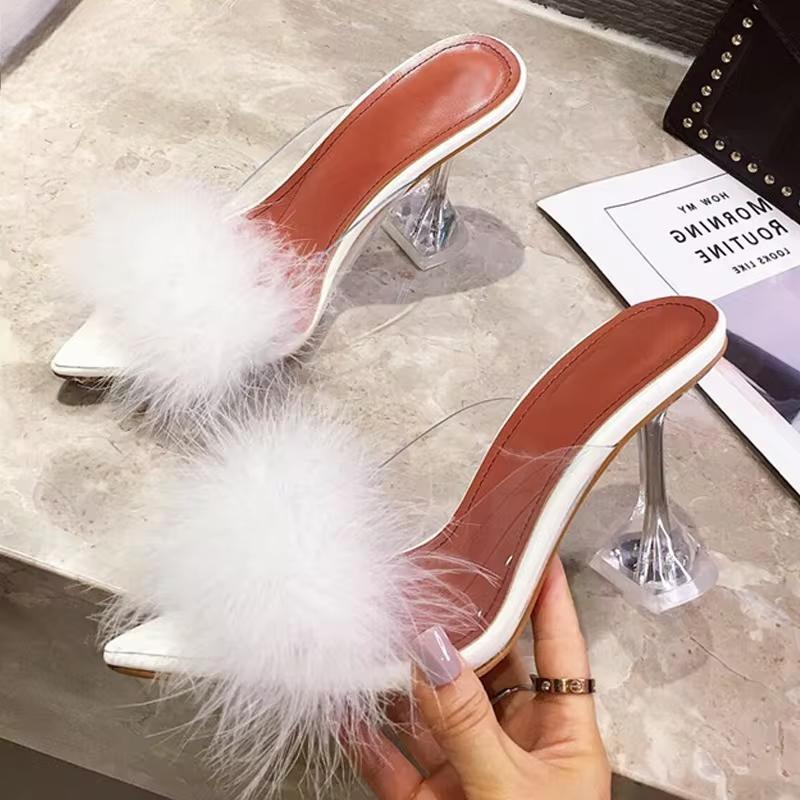 Nuevas zapatillas de tacón alto de piel con plumas transparentes de PVC para mujer, zapatos de tacón con punta abierta para mujer