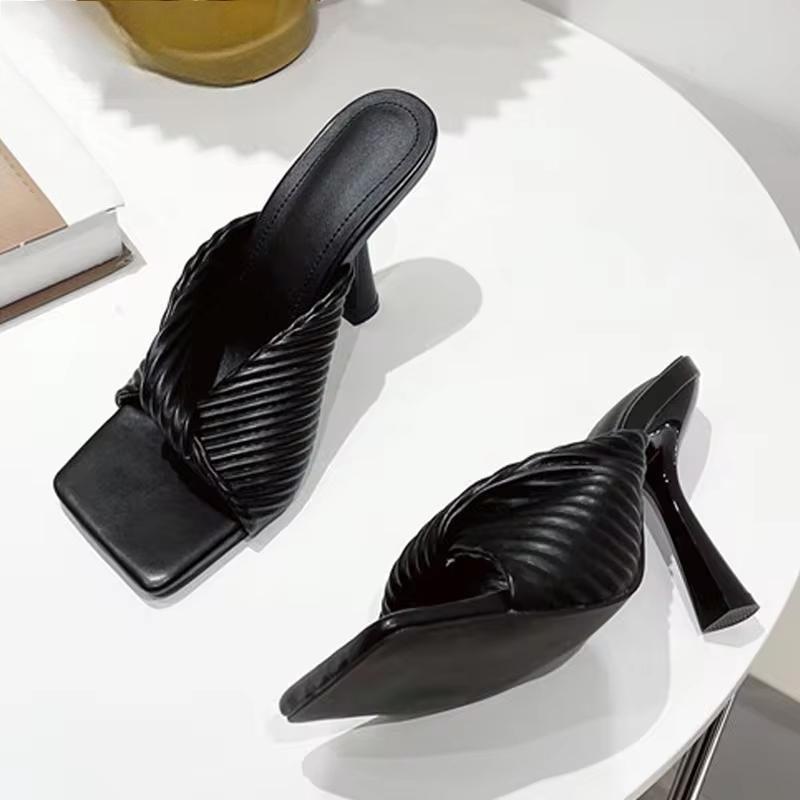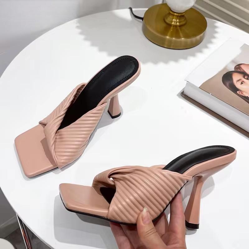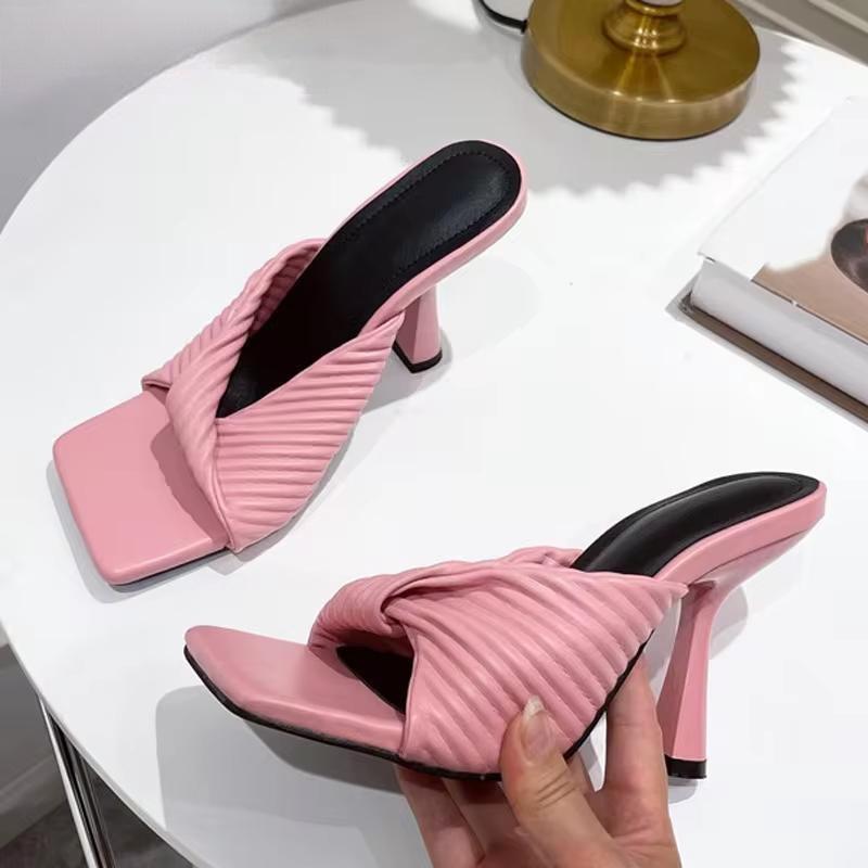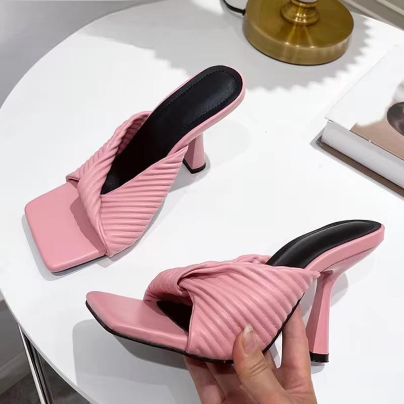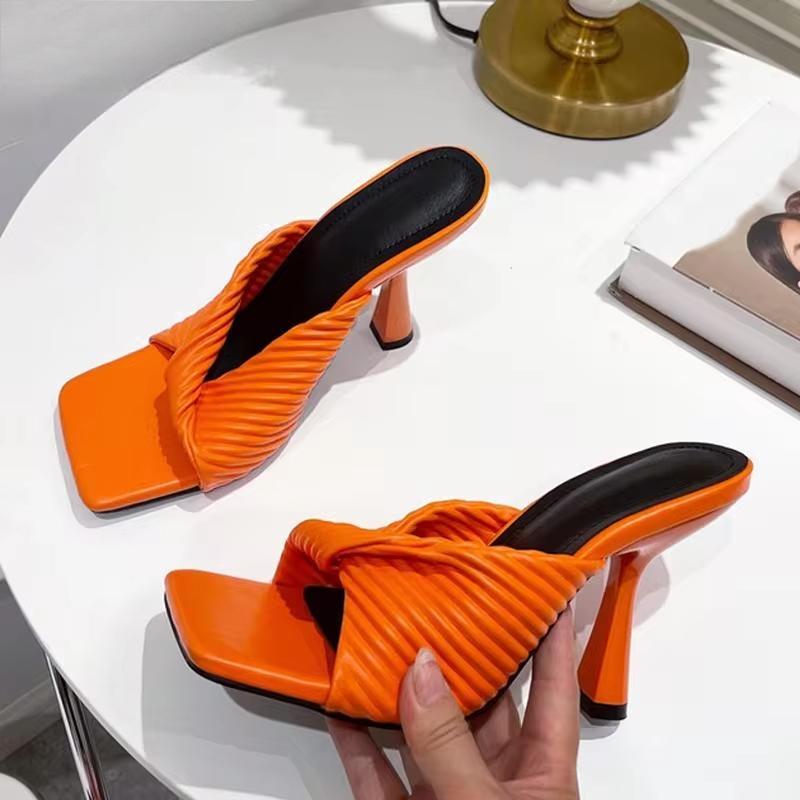 Nuevas pantuflas plisadas de verano para mujer, de color naranja, a la moda, elegantes, finas y de tacón alto.