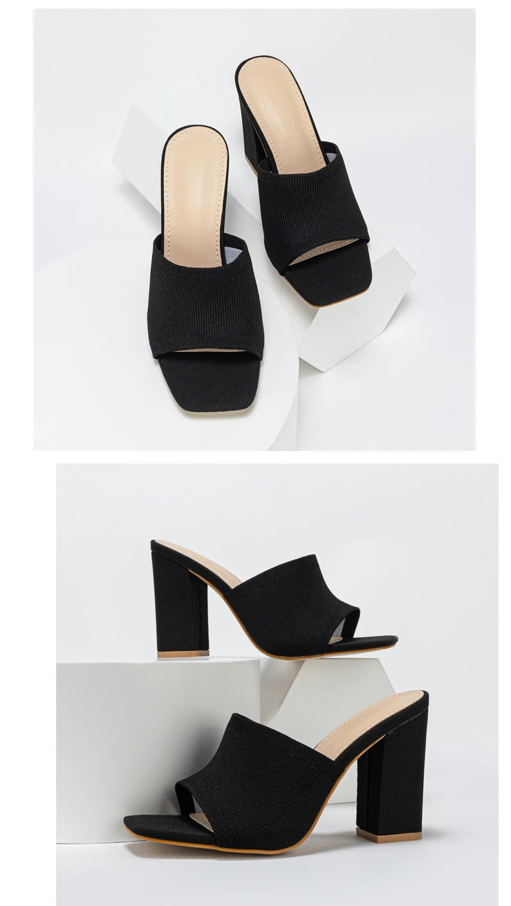 Pantuflas de tela elástica con punta cuadrada abierta para mujer, zapatos tipo mule a la moda