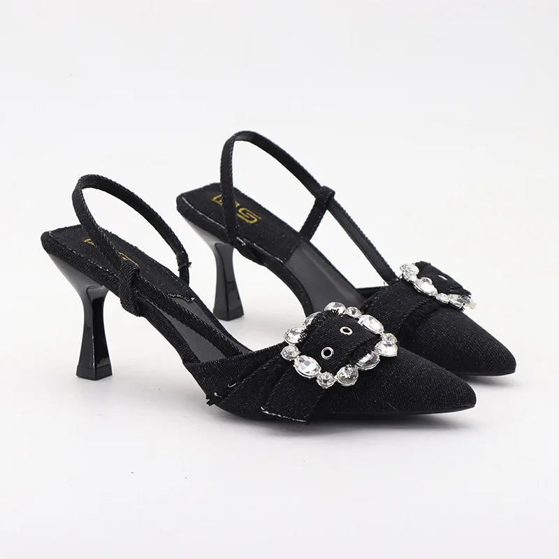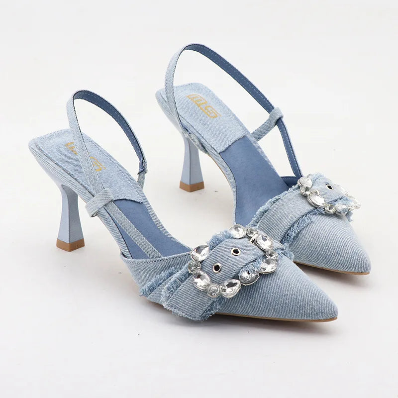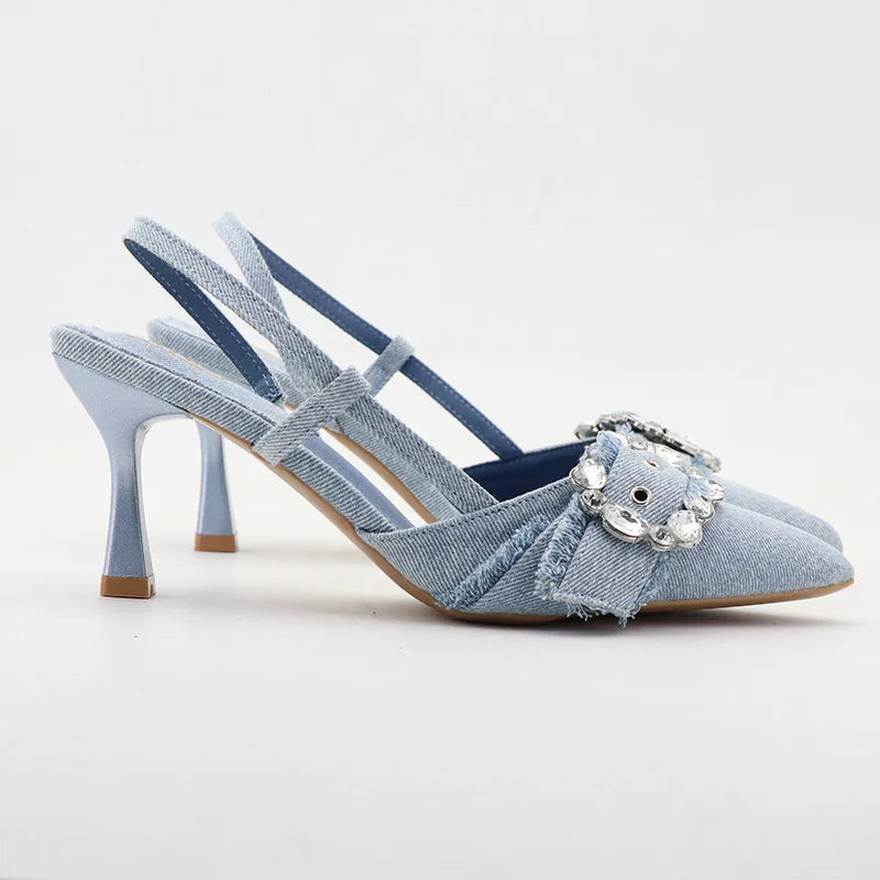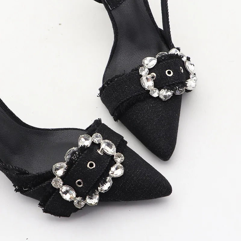 Sandalias de tacón alto puntiagudas de otoño Baotou con hebilla cuadrada de diamantes de imitación, sandalias de mezclilla para mujer con tacones de aguja, zapatos de mujer