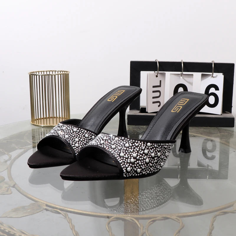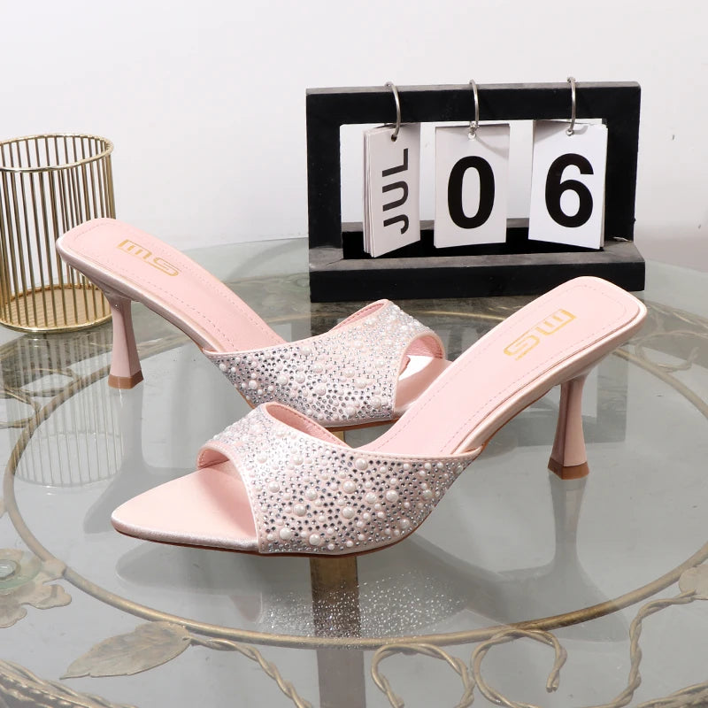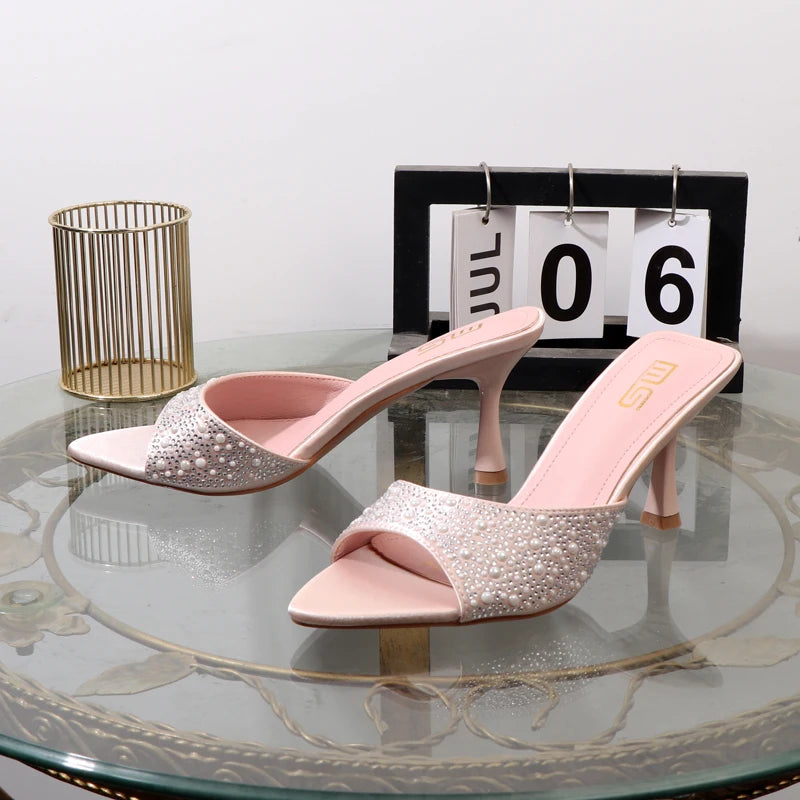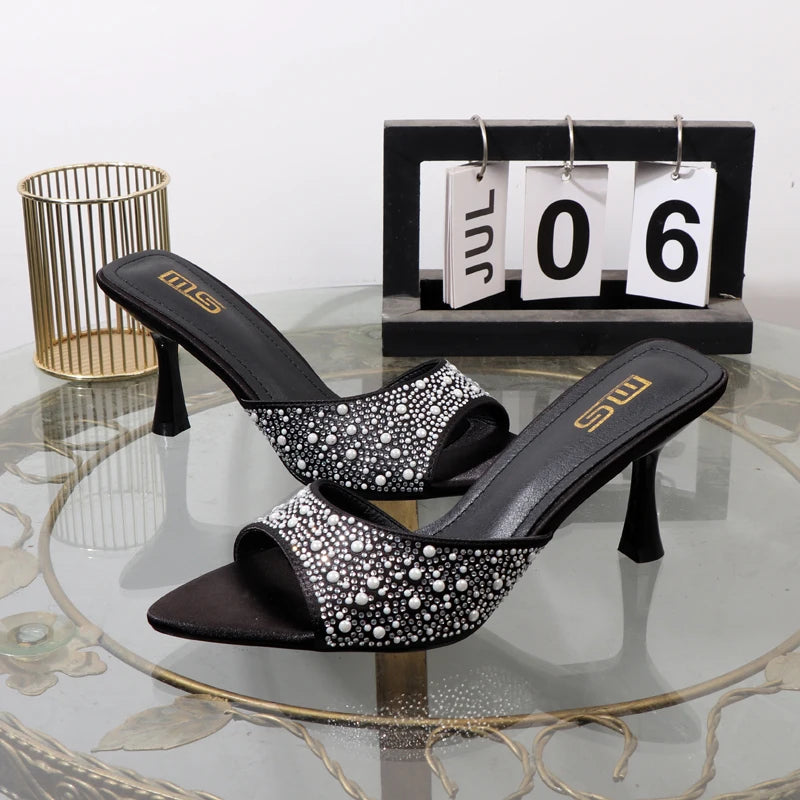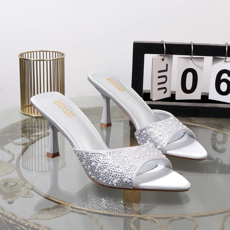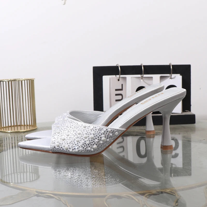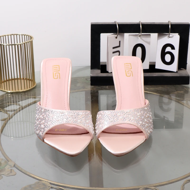 Zapatillas de verano de tacón alto y puntiagudo con tacón de pez y diamantes de imitación.
