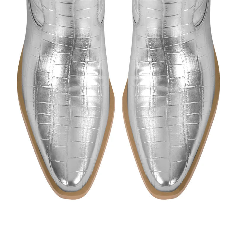 Botas plateadas por encima de la rodilla con punta puntiaguda y tacón grueso, hechas a mano.