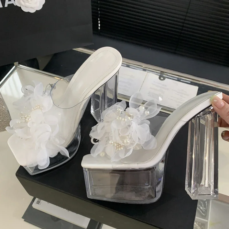 Zapatillas de PVC transparentes con flores para mujer, zapatos de plataforma con punta cuadrada y tacones altos de cristal para banquetes y fiestas, recién llegadas.