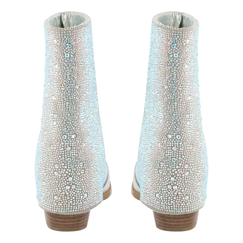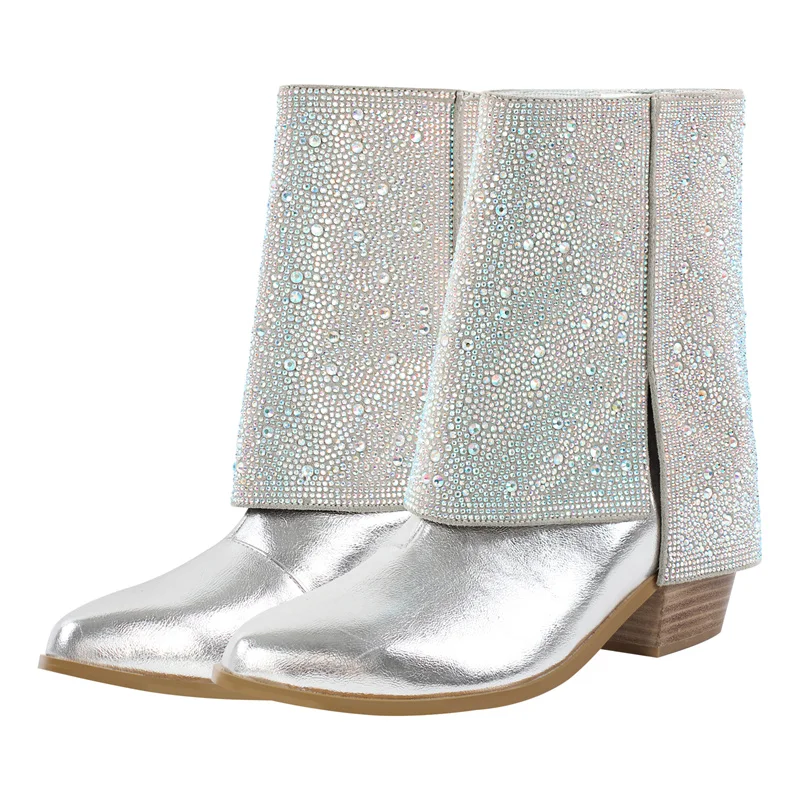 Botas de mujer con pedrería y punta puntiaguda plegables, con falda de tiburón y tacón alto grueso, botas cortas plegables para mujer