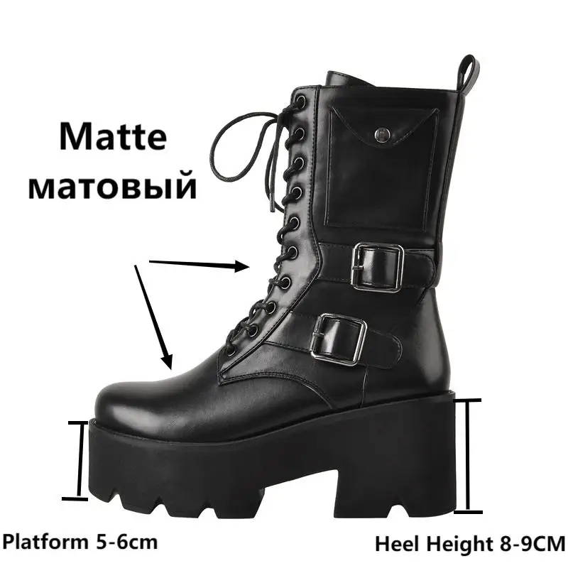 Botines de tacón alto grueso con punta redonda para mujer, plataforma negra mate, con cordones, hebilla, bolsillo lateral, cremallera, talla grande