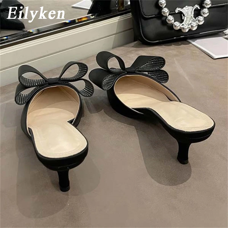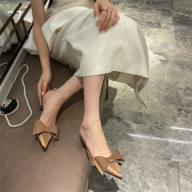 Pantuflas de satén de seda con punta puntiaguda para mujer, con nudo de mariposa, poco profundas, sin cordones, zapatos tipo mulas de tacón bajo.