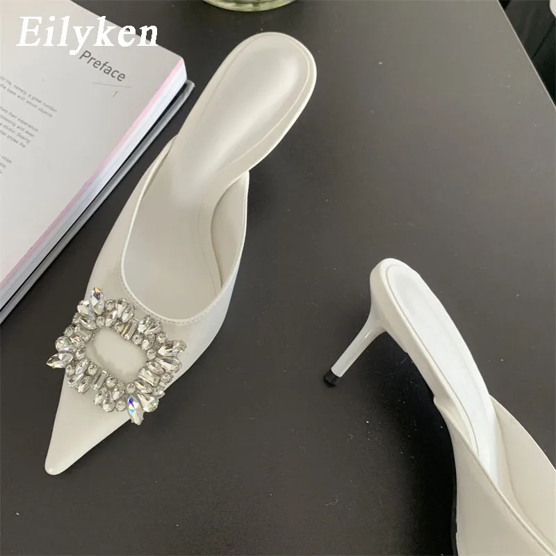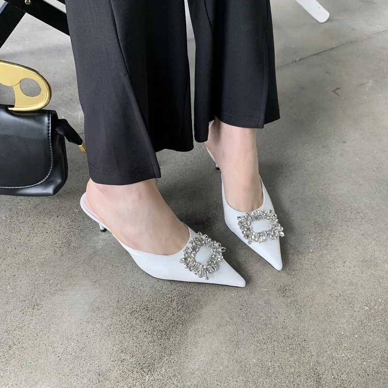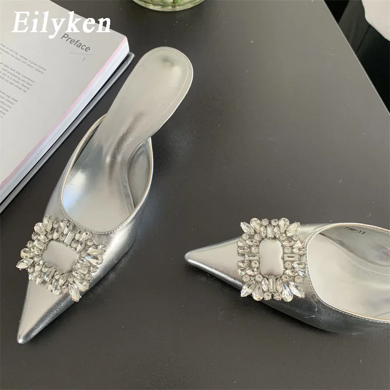 Pantuflas de primavera doradas y plateadas para mujer, con hebilla de cristal y punta puntiaguda, sin cordones, con tacón alto y fino.
