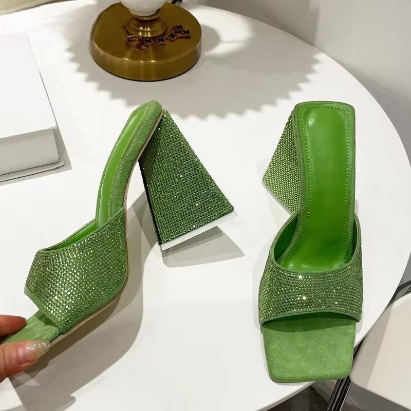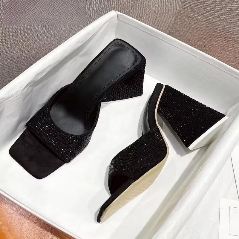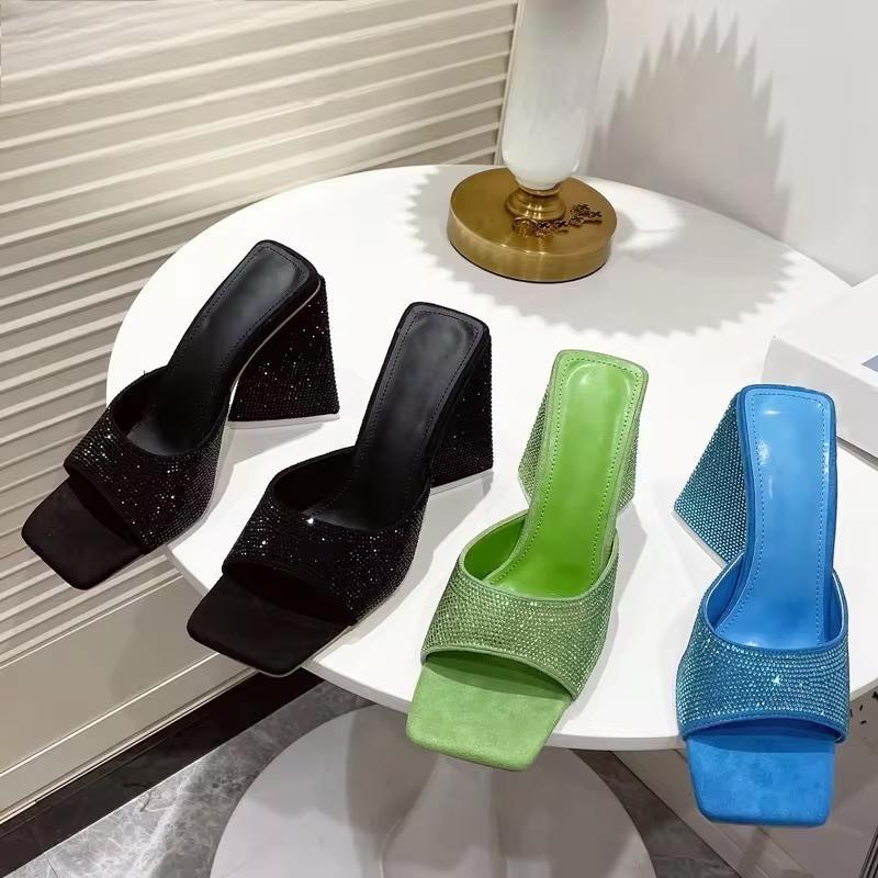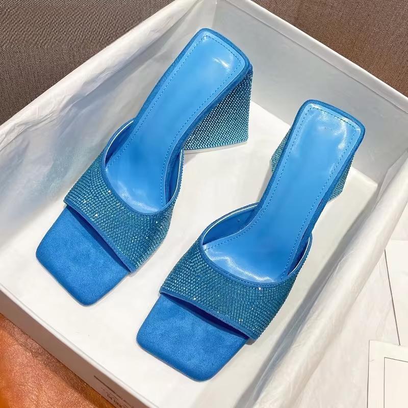 Zapatillas de verano con tacón grueso y triangular de cristal para mujer, zapatos de fiesta con punta cuadrada y sexys, talla 35-41