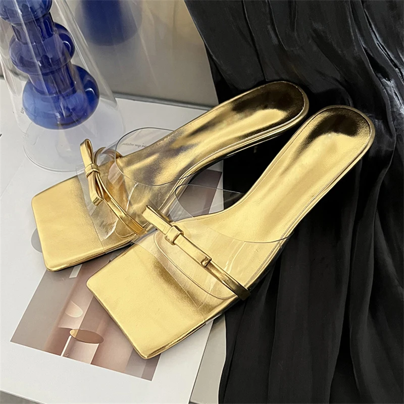 Pantuflas de verano con nudo de mariposa para mujer, de PVC transparente, con punta cuadrada y tacones bajos y finos.