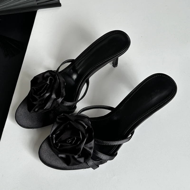Zapatillas de verano con flores para mujer, tacones bajos finos, banda estrecha, para fiesta, stripper, mulas, zapatos para mujer