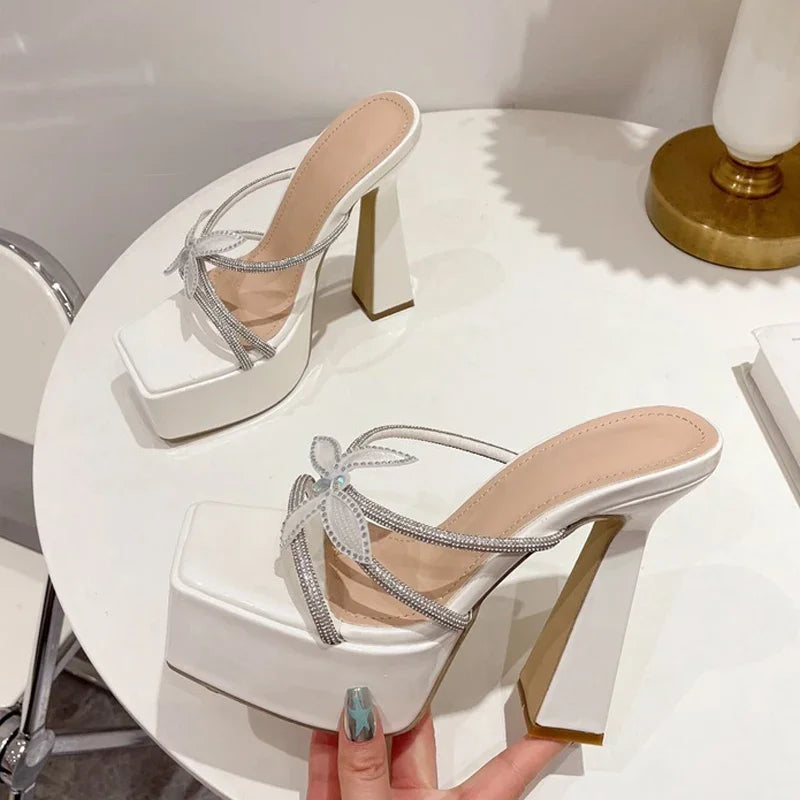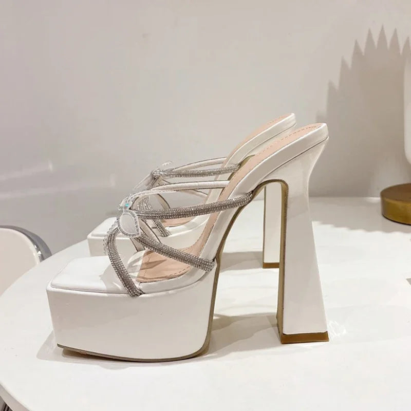 Nuevas zapatillas de gladiador de verano con banda estrecha de cristal para mujer, diseño de moda, punta cuadrada, plataforma, tacones altos, zapatos de fiesta