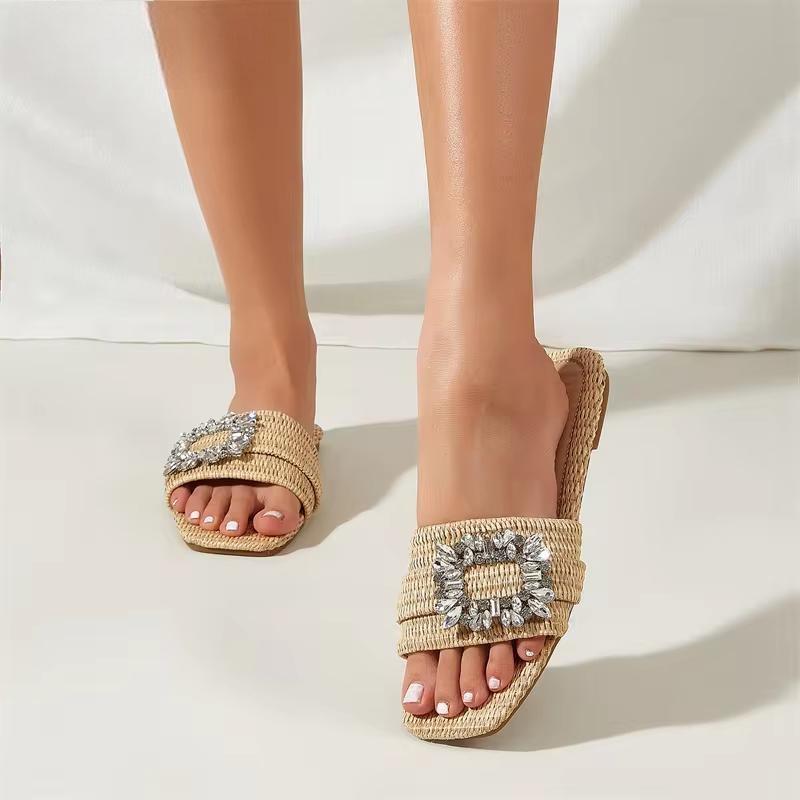 Sandalias de verano con purpurina y diamantes de imitación para mujer, sandalias de caña planas con cristales y diamantes brillantes, zapatos de playa