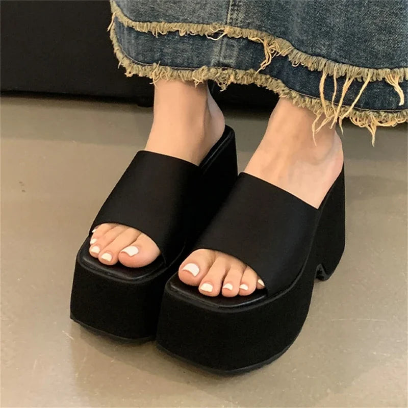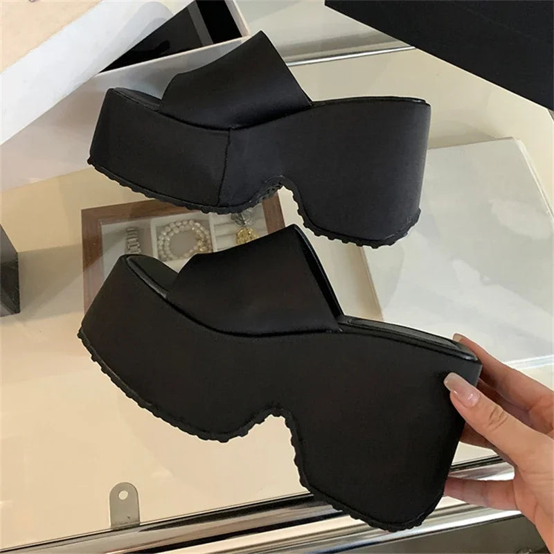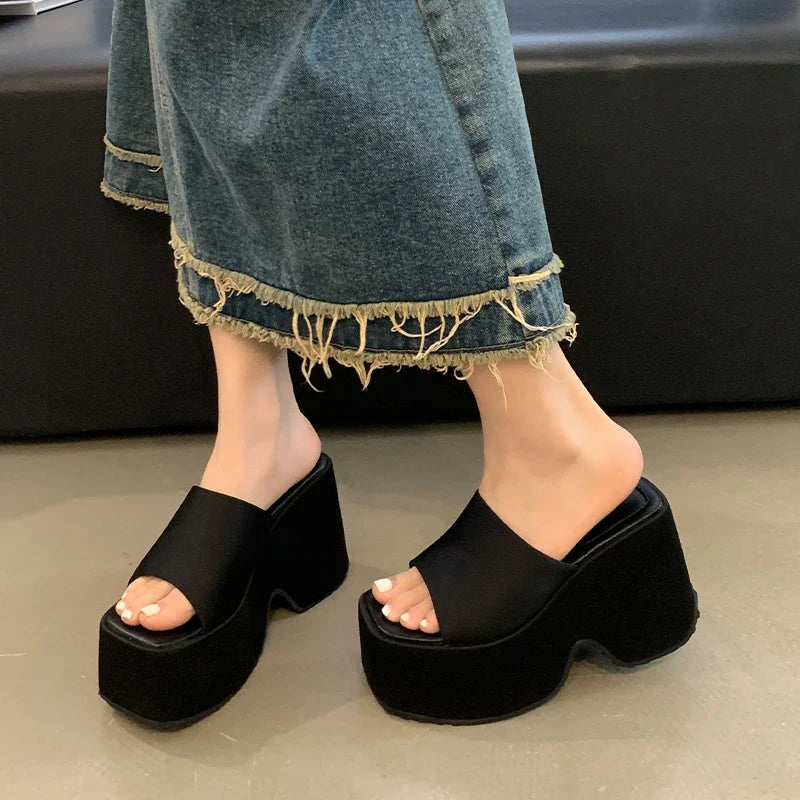 Pantuflas de satén con plataforma y punta abierta para mujer, zapatos de tacón alto y suela gruesa, de verano