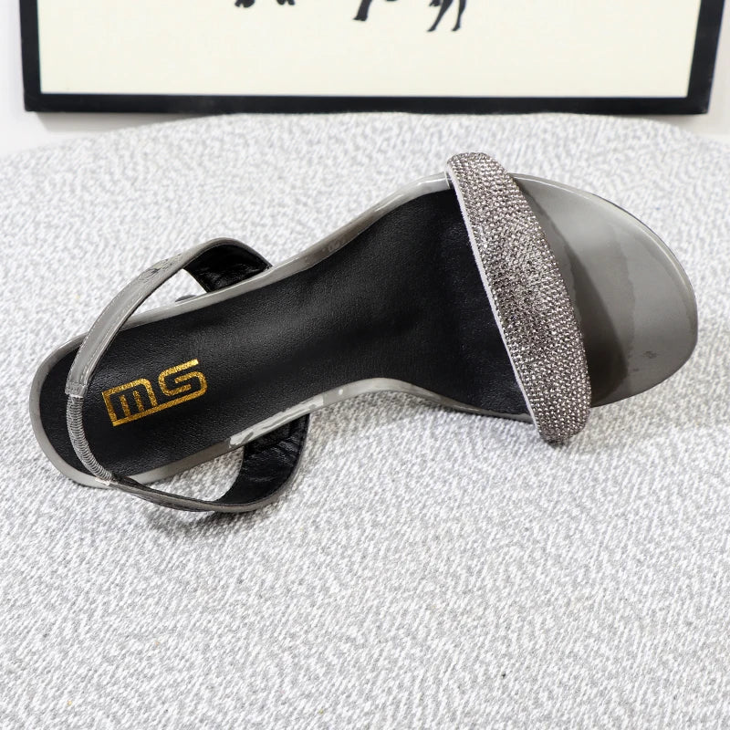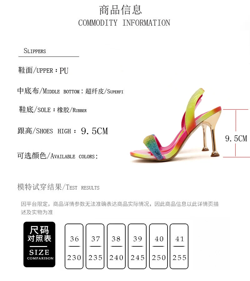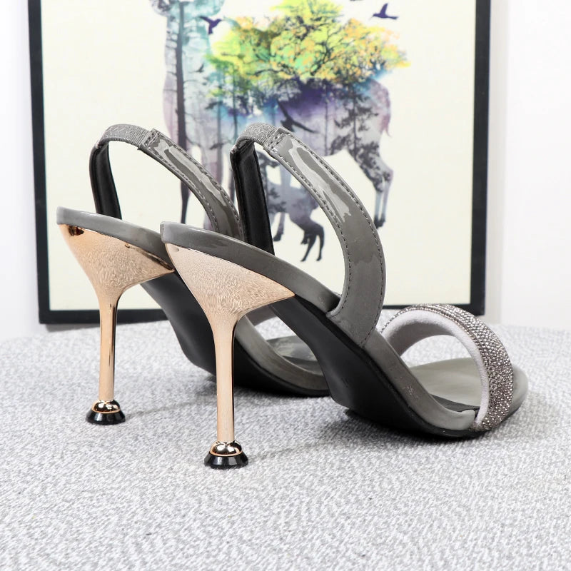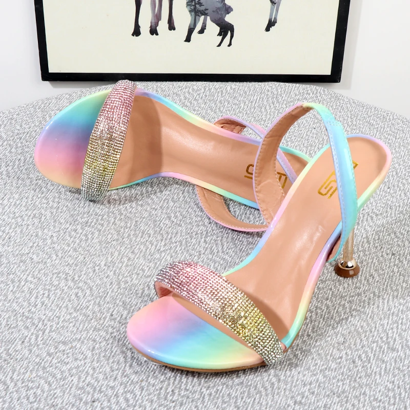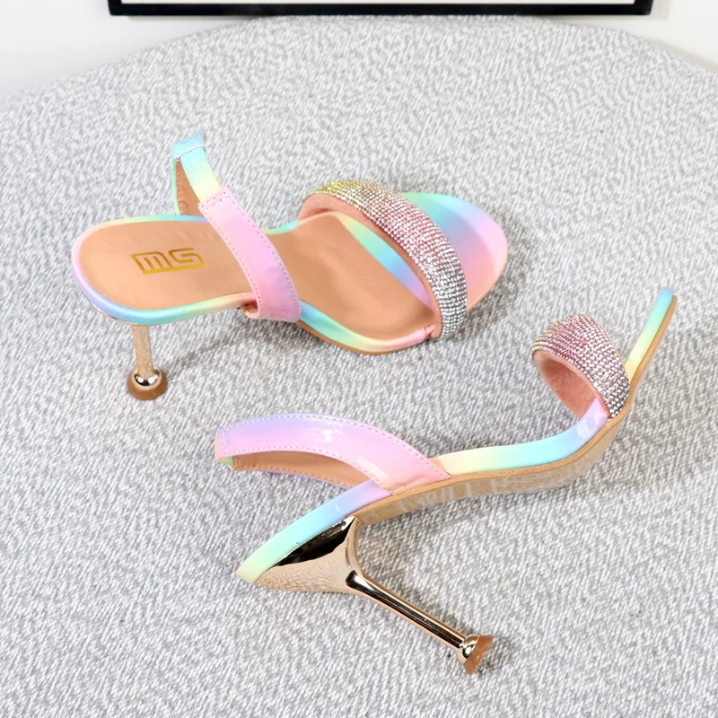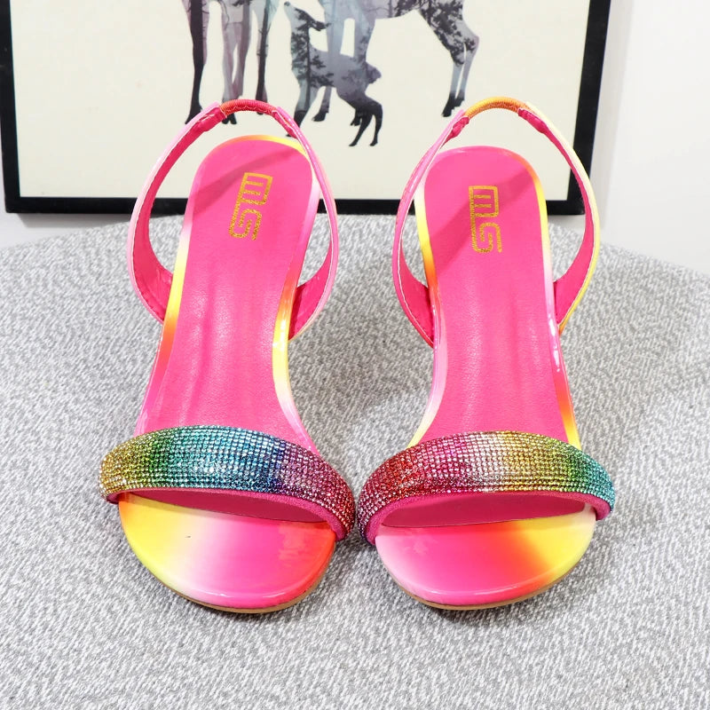 Sandalias de tacón de aguja de colores para exterior de verano para mujer, zapatos de tacón abierto con tira trasera elástica y diamantes de imitación.