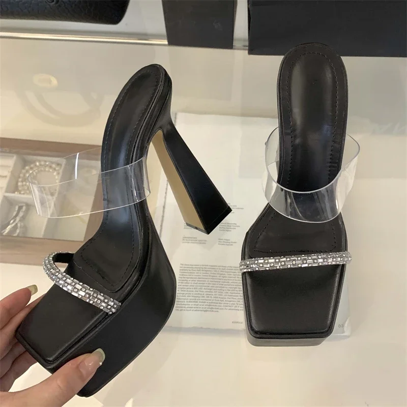 Zapatillas de verano de PVC transparente con punta cuadrada y plataforma para mujer, zapatos de tacón alto grueso de cristal a la moda