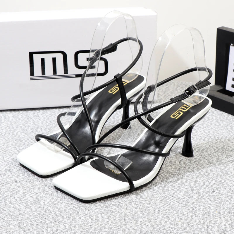 Sandalias de verano con punta cuadrada, zapatos sexis a cuadros de alta gama para mujer con tacones finos y tacones altos.