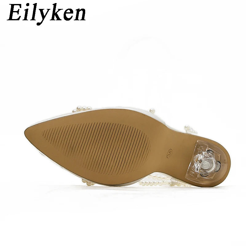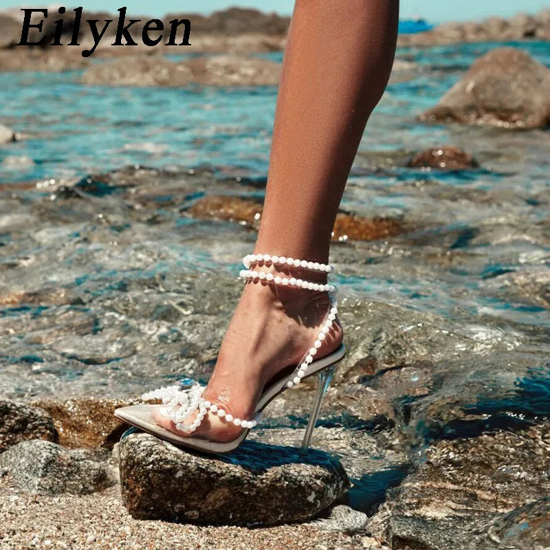 Zapatos de tacón alto transparentes de PVC blanco estilo veraniego para mujer, con lazo y cuentas, para fiesta y graduación.