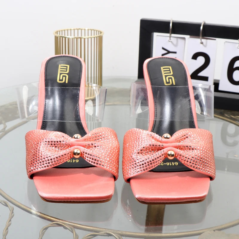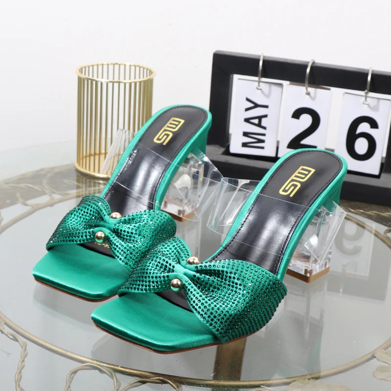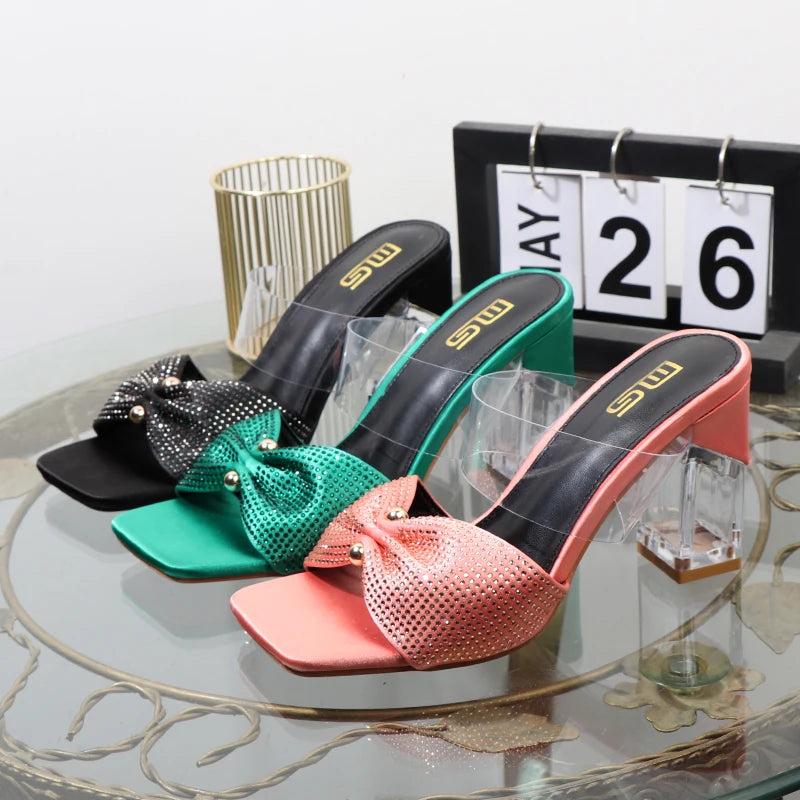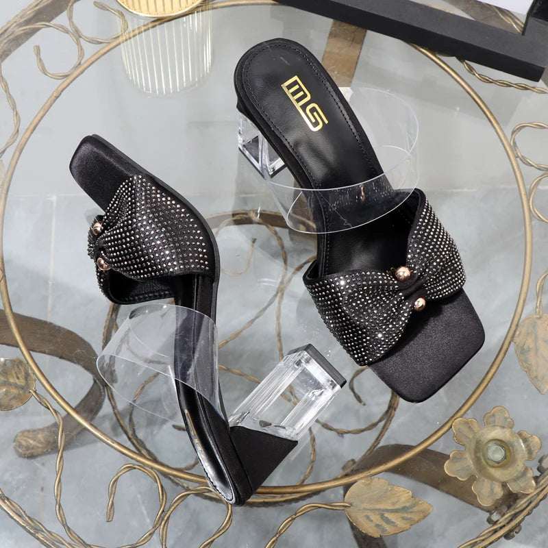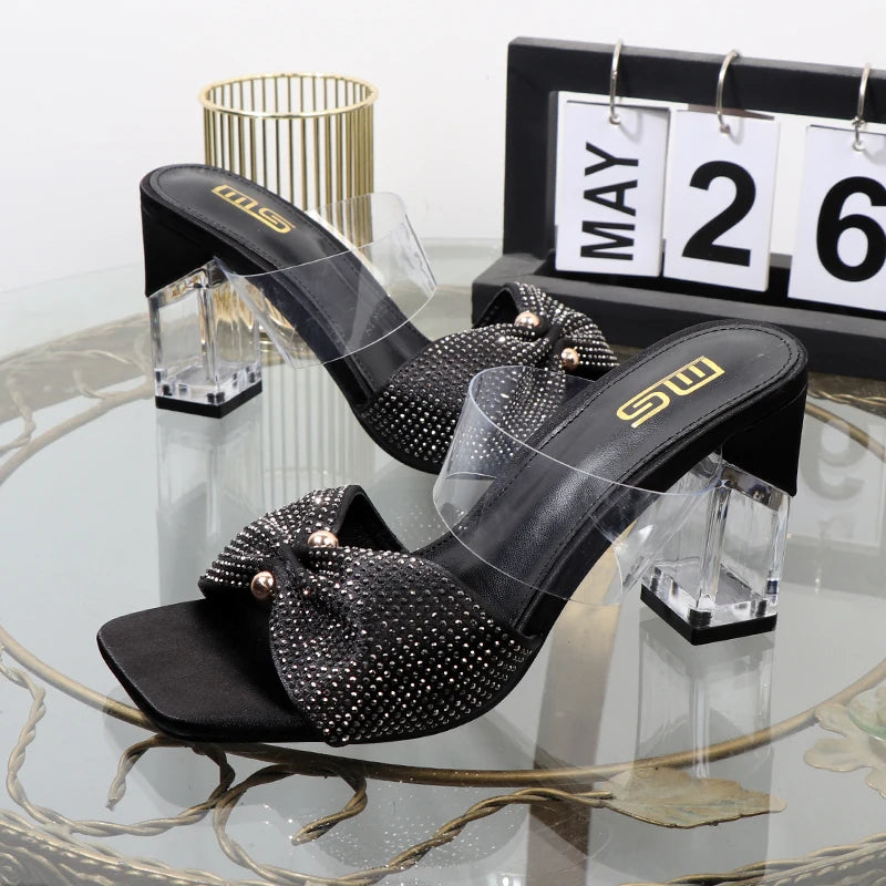 Sandalias de verano transparentes con tacón alto y tacón cuadrado de satén con punta abierta.