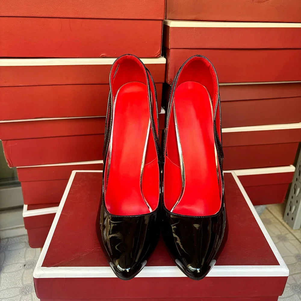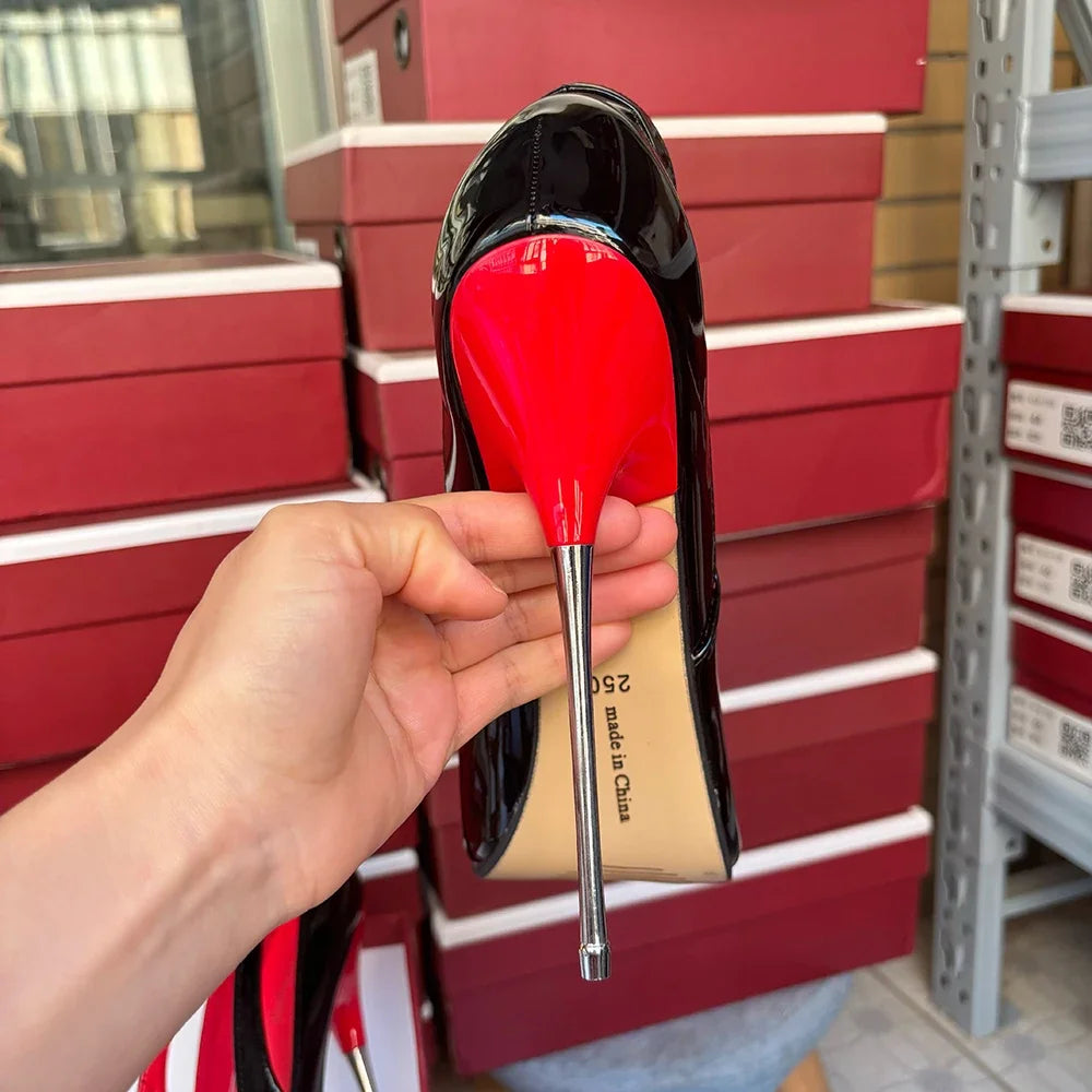 Tacones altos y finos de pasarela, tacones sexis negros y rojos en el interior.