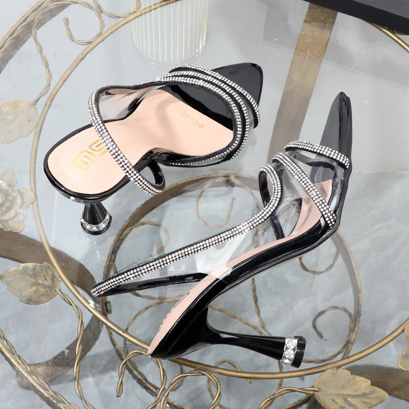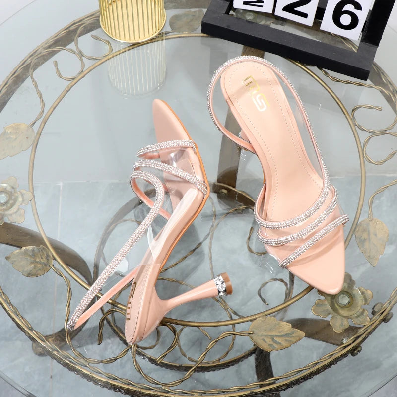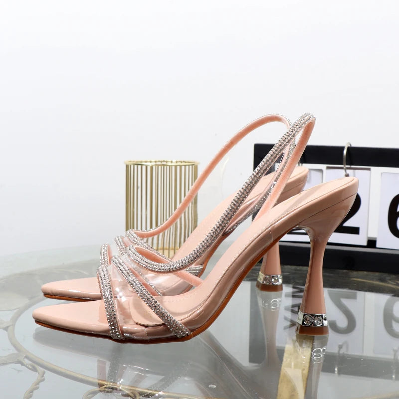 Sandalias transparentes de verano con pedrería y tacón de aguja de 10 cm.