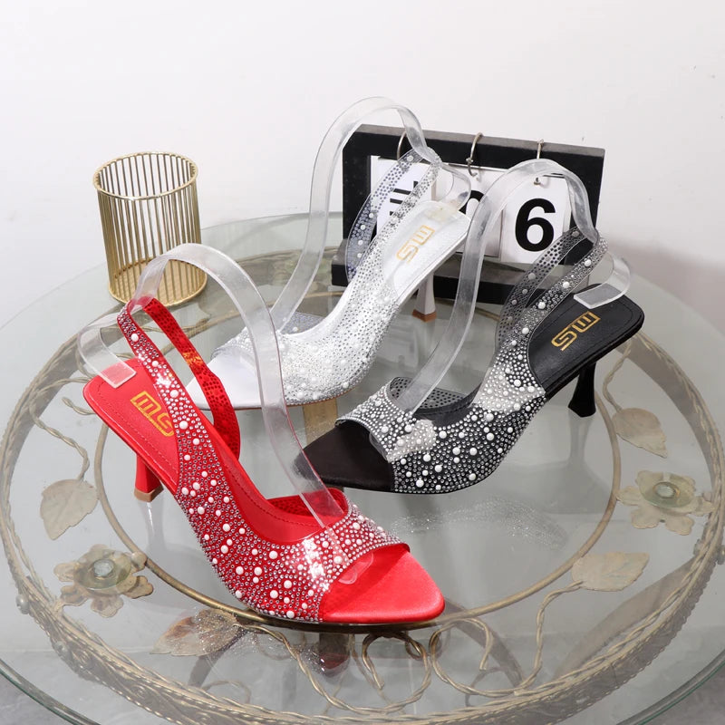 Sandalias transparentes de verano con diamantes de imitación y punta abierta para mujer, zapatos de tacón elegantes y puntiagudos de satén a la moda.
