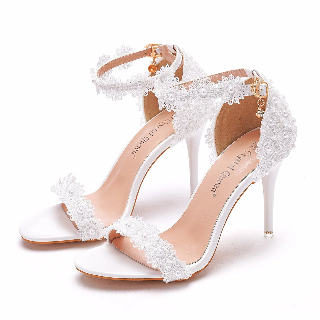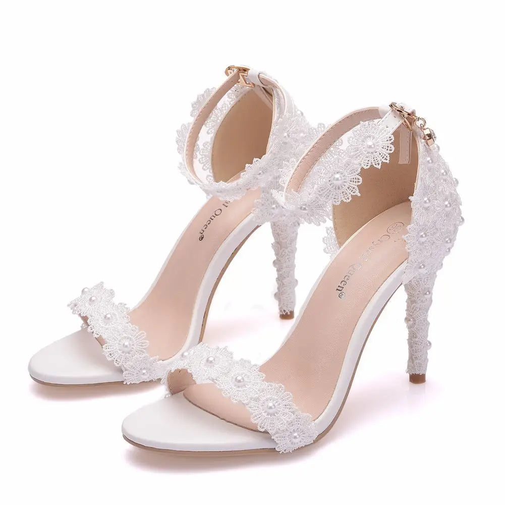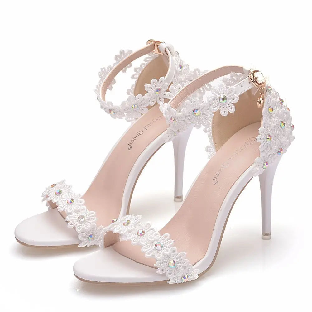 Sandalias elegantes de fiesta con flores y encaje en el tobillo, de color blanco, con tacones altos y finos, para mujer, talla grande, para oficina, boda, verano, Stilettos