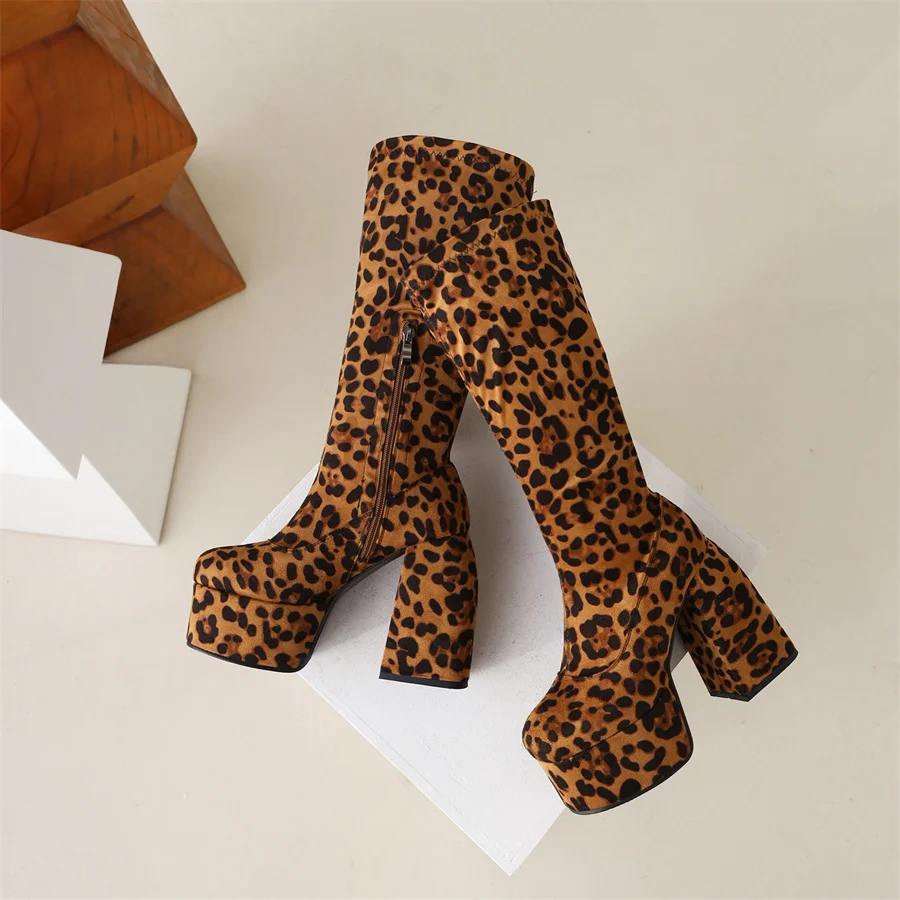 Botas cálidas de leopardo para mujer, de invierno, con plataforma, punta redonda, cremallera, clásicas, concisas, tacones altos gruesos, botas de vestir para fiesta.