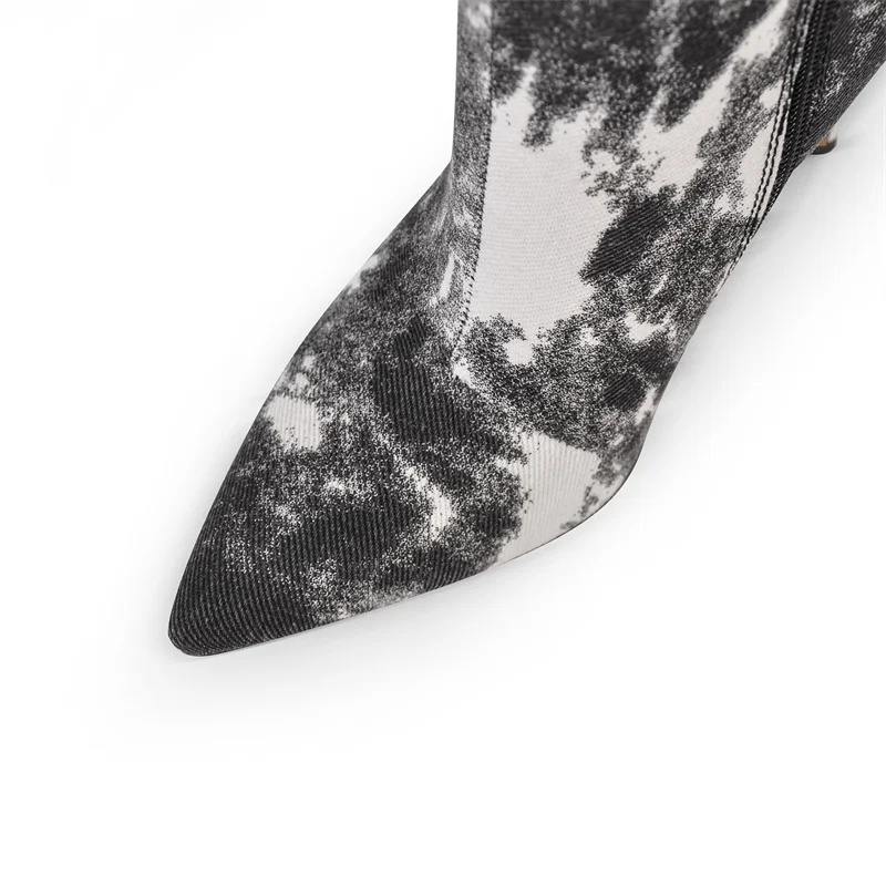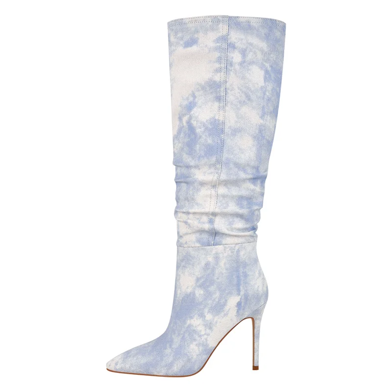 Botas altas hasta la rodilla con punta puntiaguda de mezclilla para mujer, botas largas de moda con tacón de aguja y cremallera lateral