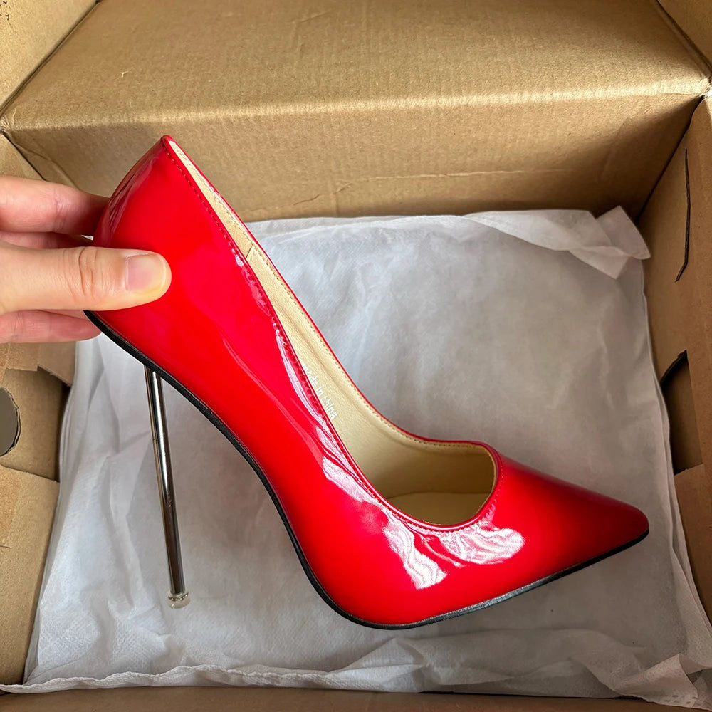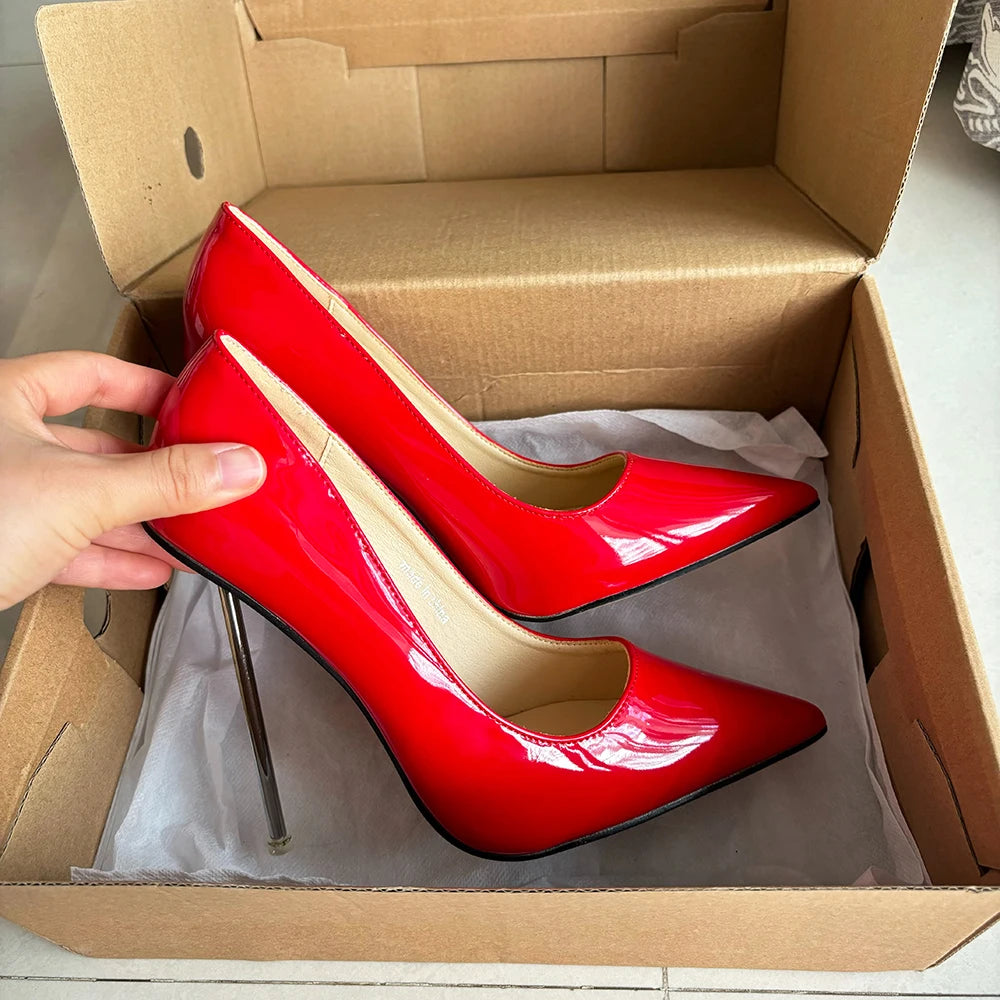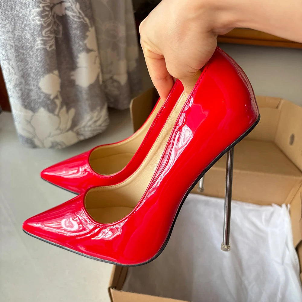 Zapatos de tacón de aguja de metal para mujer, finos y altos, rojos brillantes, con punta puntiaguda, para fiesta, boda, dama de honor, unisex, talla grande