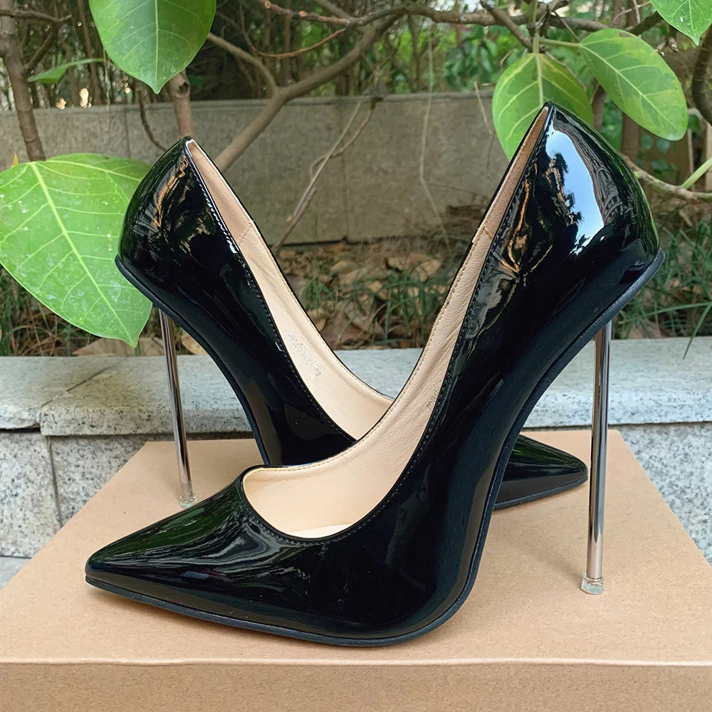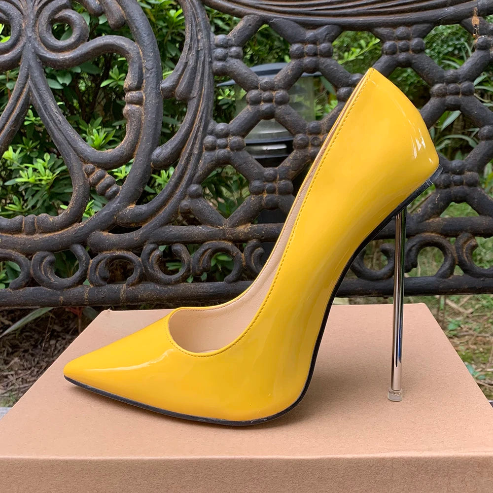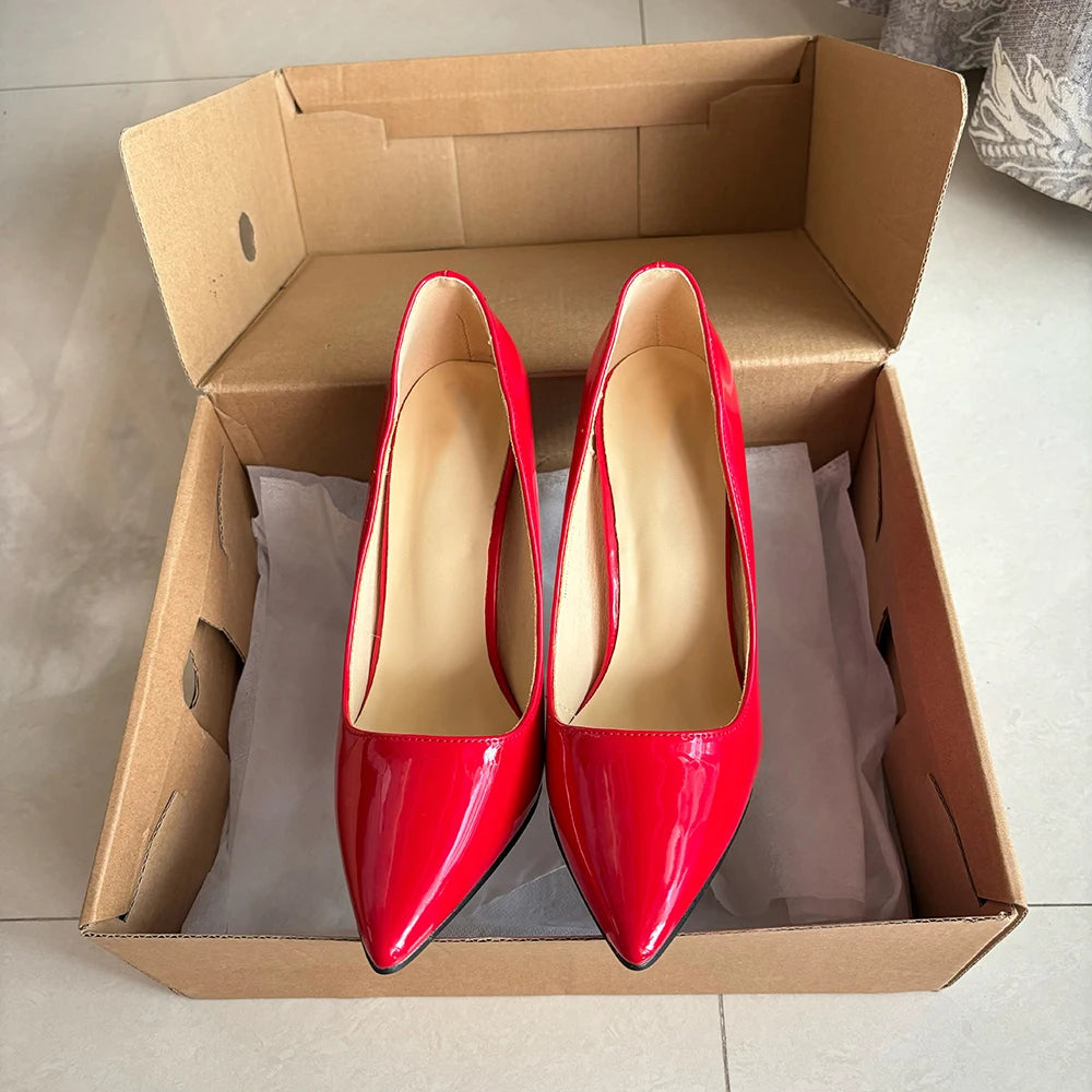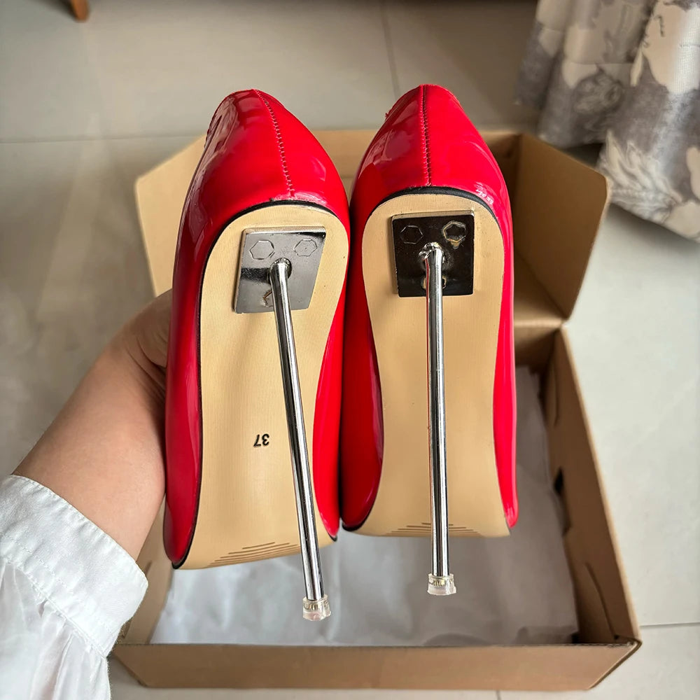 Zapatos de tacón de aguja de metal para mujer, finos y altos, rojos brillantes, con punta puntiaguda, para fiesta, boda, dama de honor, unisex, talla grande